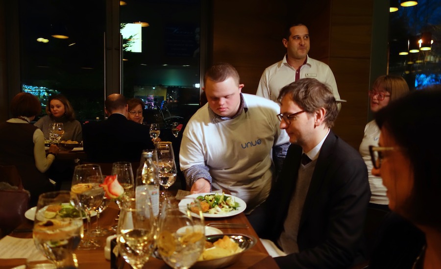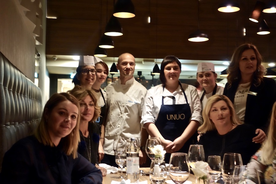 Vlasnica murterskog restorana Fine Food Murter Gracia Horvatin, Luka Šešlek i Juraj Obad kao prvo glavno jelo večeri poslužili su Goveđi jezik sous vide s pireom od celera, a kuharica Melania Toman s Marijom Matešom i Viktorom Glihom pripremila je fini confit od pačjih bataka s orzottom i pjenicom od cikle. Cijela večera bila je sjajno iskustvo, u dobroj atmosferi i enegiji, sve je teklo glatko, a gosti su uživali u dobroj hrani, vrlo korektnim Krauthakerovim, Zdjelarevićevim i Deklićevim vinima i nadasve u šarmantnoj posluzi. Desert slatičarke Sanje Sajko, zlevku s kremom od sira i crumbleom od maslaca, u čijoj su pripremi sudjelovali Milica Karas, Đuro Zgajilac i Ana Kočka, odlično je zaokružio ovu lijepu i optimističnu večer. Kulinarsko mentorstvo i rad Vedrana Habela s osobama s invaliditetom jedna je od najvrjednijih inicijativa u hrvatskom ugostiteljstvu. Jer ugostiteljstvo je biznis kroz koji se, zbog njegove naravi i ubrzanog rasta, u tržište rada može uključiti značajan broj ljudi koji kreću s težih početnih pozicija. Ono što na tom području rade ljudi poput gospodina Habela, različitih udruga ili kompanija poput Valamara, pokazuje kako se to može učiniti, a večere visokoh profila poput ove koju je kao partner UNUO-a u utorak navečer priredio Hilton Double Tree trebale bi biti primje kako to uključivanje promovirati i vrednovati.