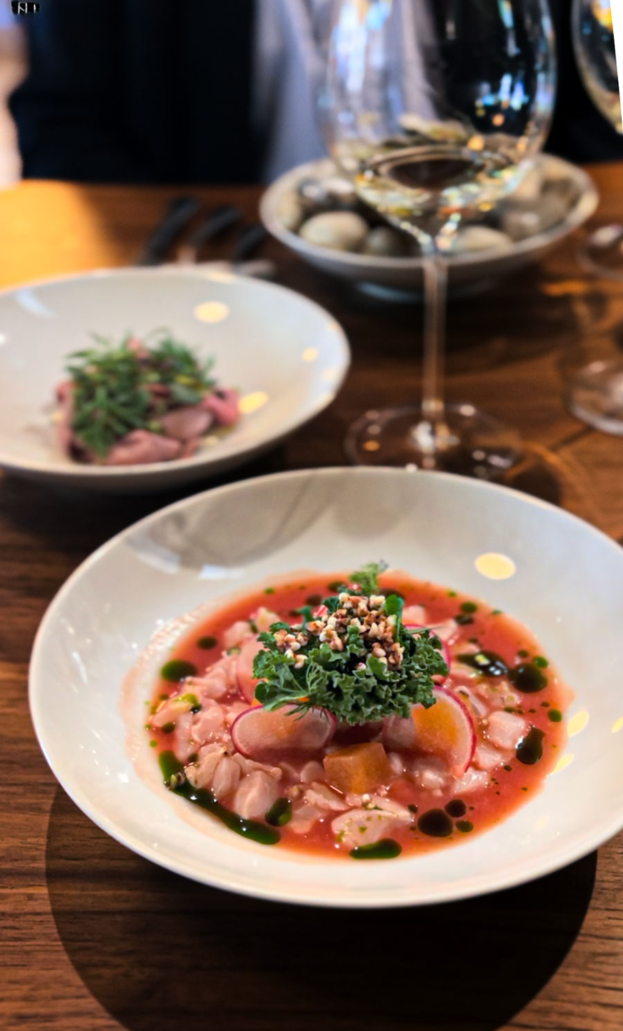 Ceviche od orade pliva u leche de tigre na bazi laktofermentiranih rajčica s uljem korijandera, slasnom mrkvom i kokicama od heljde. Kruhovi iz Pekarne Ana su više nego senzacionalni: sourdough je kompleksan, intenzivan, sočan, s tankom hrskavom korom i sjajno se slaže s tolminskim maslacem punim čistih mliječnih okusa. Focaccia s kozjim sirom i maslinovim uljem veoma je masna i slana, ali je ne možete prestati jesti.