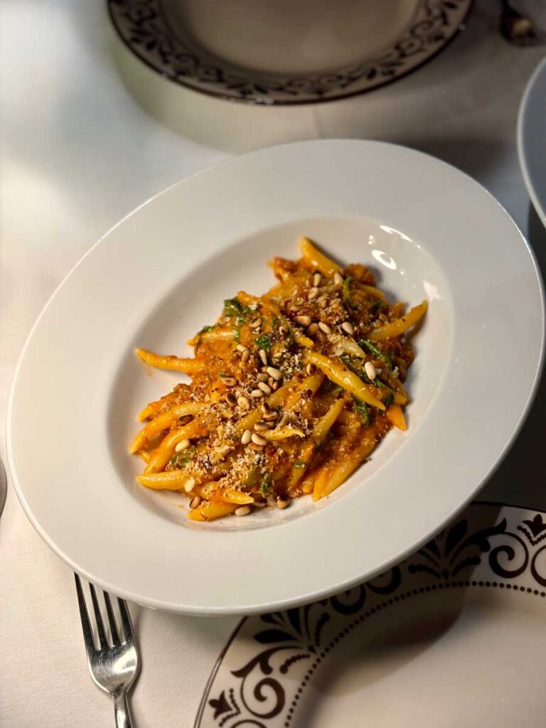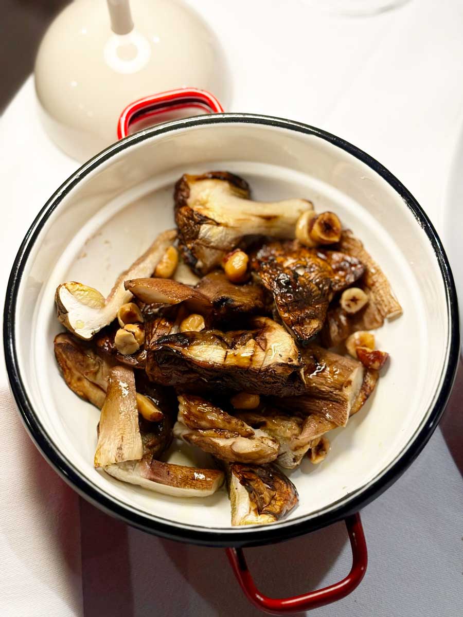 Juneći carpaccio s kremom od gljiva i fermentiranim lisičarkama snažno je otvorio večeru i stilski pripada višoj kuhinji. Alla Beccaccia je sinoć osim bijelih tartufa imala i puno vrganja, lisičarki i crnih truba. Naravno, sve gljive su u Alla Beccacciu stigle svježe. Fritaja s kombinacijom svih gljiva pokazala je da su vrganji trenutno fantastični. Pašta s domaćom šalšom, kobasicama i pinjolima još je jedan dokaz da znaju sa tjesteninom, umacima i kombinacijama.