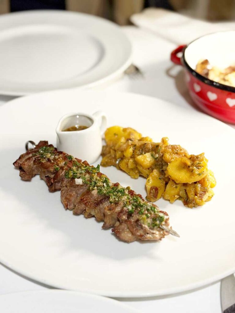 Najbolja su bila glavna jela. Ražnjić od crvene svinje i rebarca od vepra zvuče kao da pripadaju nekoj istarskoj verziji pubovske hrane. Što nije daleko od istine, ali je Alla Beccaccia okuse podigla na zavidnu razinu. Ražnjići su bili lijepo pečeni, posuti krupnom soli i završeni vrlo dobrom salsom verde, a uz jelo je došao i domaći umak od meda i senfa intenzivnog okusa. Restani krumpir se vrlo dobro složio s ovim odličnim rustikalnim okusima. Rebarca od vepra na padelu bila su bogata i okrepljujuća. Mesnati vrganji sa žara su bez konkurencije najbolji koje smo probali ove sezone. Odličnu večeru završili smo creme bruleeom s bučinim sjemenkama.