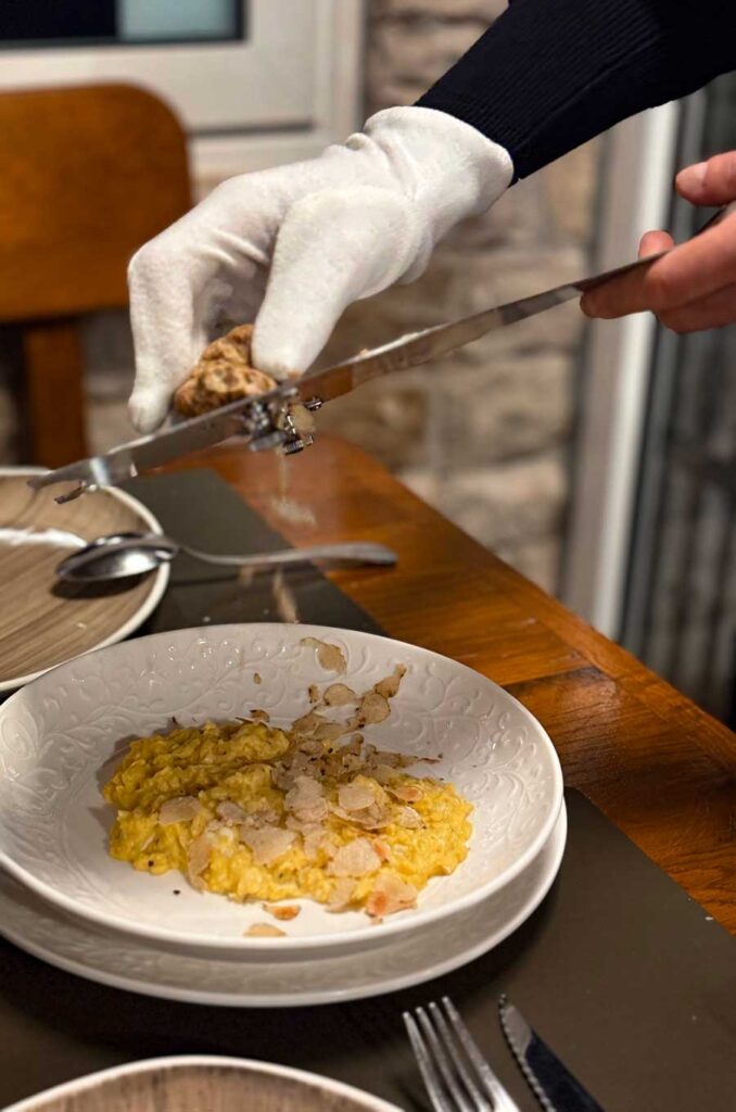 Fritaja s bijelim tartufima je među boljima koje smo probali u istarskim konobama, s pogođenom kremastom teksturom i slankastim okusom koji nadopunjuje zemljanost tartufa. Tagliatelle su bile vrhunske. Jednostavni umak na bazi maslaca i u minutu skuhane tagliatelle također, su jedan od boljih načina da se degustiraju bijeli tartufi. Osim jela s bijelim tartufima, Primizia ima vrlo dobar kruh koji sama radi, kao i fritule koje smo uspjeli probati za desert. Primizia, kao i San Rocco, ostaju najatraktivnija istarska mjesta za tartufe. Uz jela smo pili Gran Teran istarske vinarije Coronica, a račun smo platili 136 eura. S ozbirom da je svako naše jelo sadržavalo bijele tartufe cijene se mogu smatrati odličnom vrijednosti za novac.