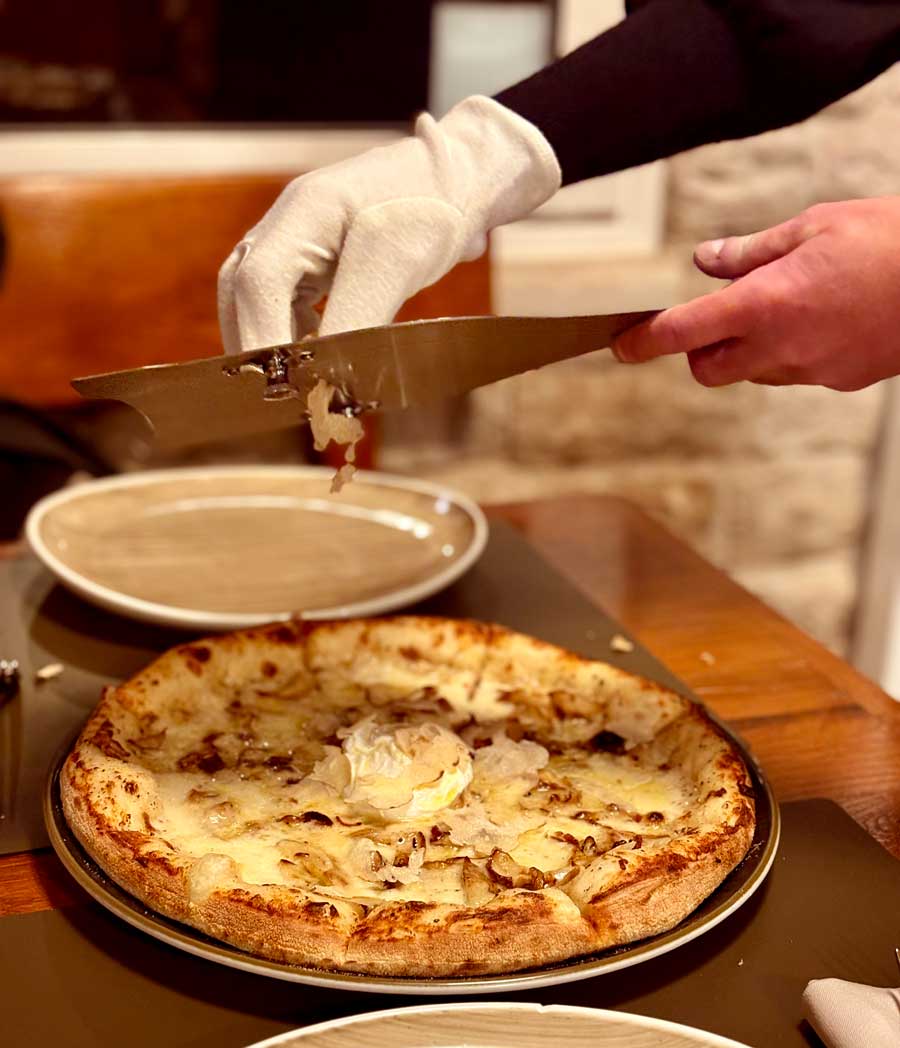 Primizijini bijeli tartufi, koji su u restoran stigli prije tri dana, aromatični su i imaju duboki zemljasti okus, dok su primjerci nešto veći od prosjeka. Također, ima ih u dovoljnim količinama. Ribati bijele tartufe na pizzu pokazalo se kao odličan potez iz više razloga. Pizzu vole svi i obogatiti ovo popularno jelo luksuznim namirnicama poput bijelog tartufa jest način da se što više ljudi upozna s jednom od najvažnijih hrvatskih i istarskih sastojaka. Primizia također, radi vrlo dobre pizze, neke od najboljih u Istri, hrvatskoj regiji pizza. Njene su pizze prozračne, lagano hrskave i imaju puno karaktera. Pizza s bijelim tartufima dolazi u kombinaciji s poširanim jajetom koje daje kremoznost i ultra svježim vrganjima, pa postaje bogato kalorično jelo. Primizia je dobro cjenovno pozicionirala svoju pizzu s bijelim tartufima na 22 eura.