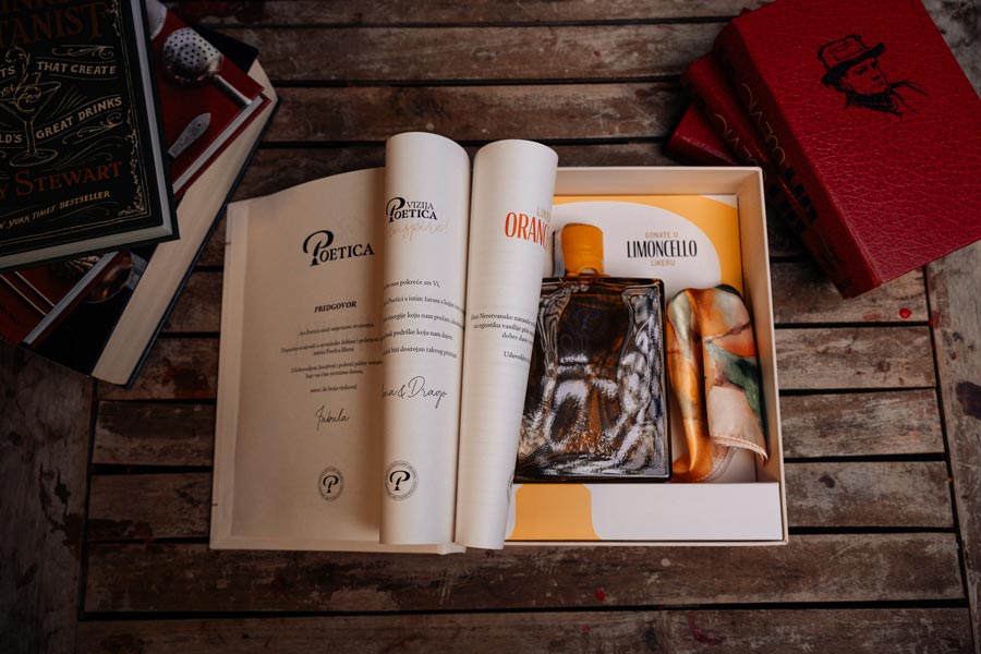 Da, standardnoj formama poklon pakiranja s destilatom i čašama, dodali smo novi element. Poklon kutija sadrži zvučni modul koji reagira na svjetlost i kad se otvori započinje recitirati poeziju. Koliko god smo vjerovali u ideju, pitali smo se hoće li biti kontroverzna za tržište. Pokazalo se suprotno, kupci su oduševljeni. Poklon kutija konceptnih likera, pak, slavi kreativnost. Prvi dojam kad je držite jest da vam je u ruci knjiga. Kad je otvorite uvodno možete pročitati par stranica o filozofiji umijeća stvaranja, pozdrav autora Poetice, ponešto o liniji Sonate u likerima i stranicu zahvala svima koji su sudjelovali u produkciji. Kupcima se najviše sviđa je zadnja stranica, gdje se uz bocu likera nalazi svilena marama oslikana motivima voća i trava od kojih ne napravljen. Autorica je Maya Beus, poznata modna i event sketcherica.