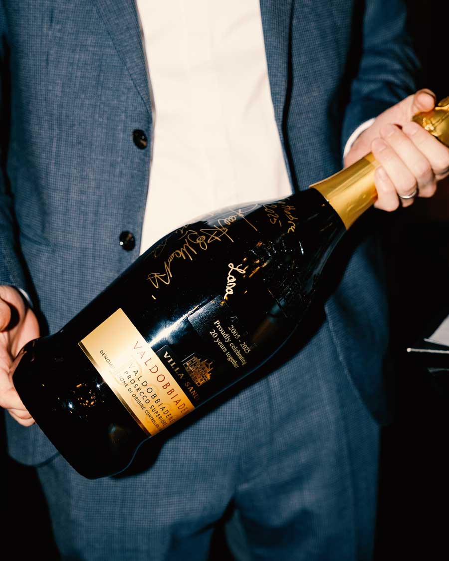 Večera je počela s Villa Sandi Il Fresco DOC Rosé Millesimato Brutom 2024, jednim od prvih rose prosecca nastalih 2020. godine kada je konzorciji Prosecco DOC nadopunio pravila apelacije i dopustio ružičaste pjenušce. Uz jela su se točili  Valdobbiadene Prosecco Superiore DOCG Millesimato Brut 2024 te friulano, pinot grigio i merlot vinarije Borgo Conventi iz Collia koja je također u vlasništvu Ville Sandi. Za kraj večere uzvanici nazdravili su Valdobbiadene Superiore di Cartizze DOCG La Rivetta, čije grožđe dolazi s najpoznatijeg položaja za uzgoj prosecca.