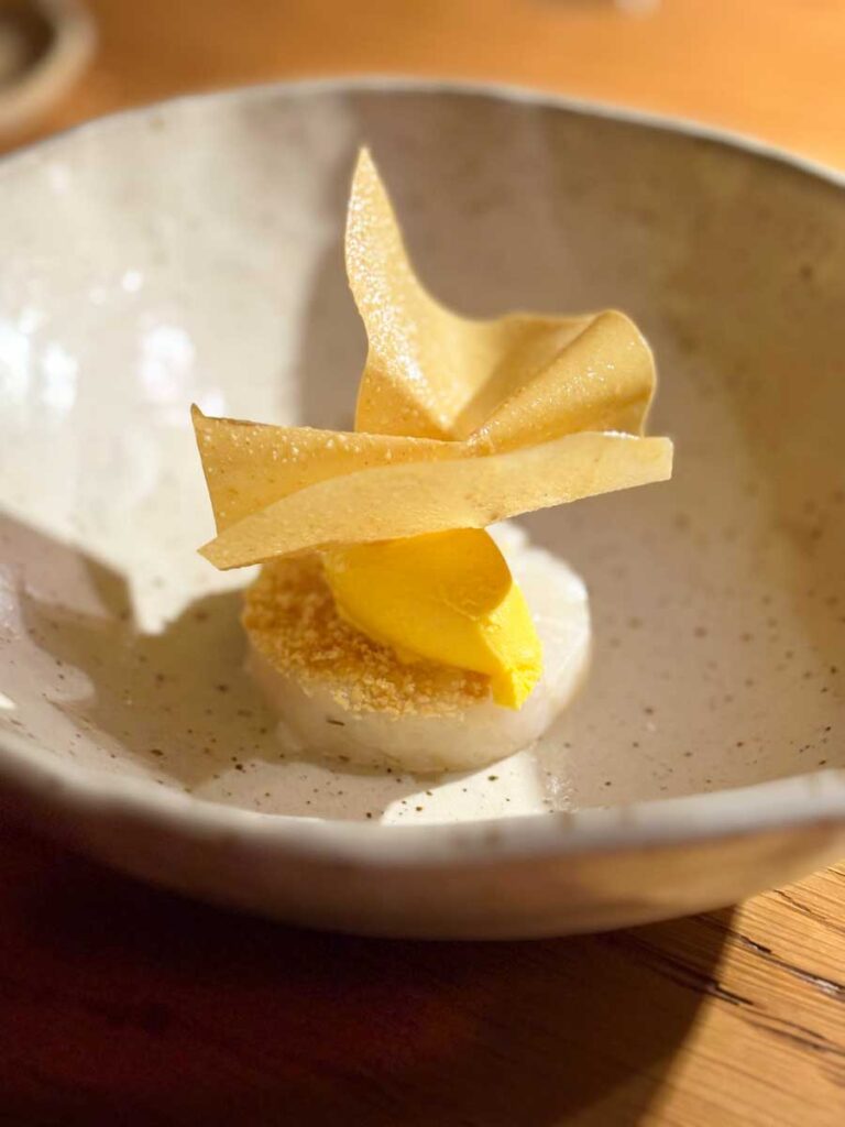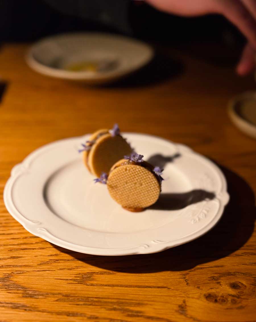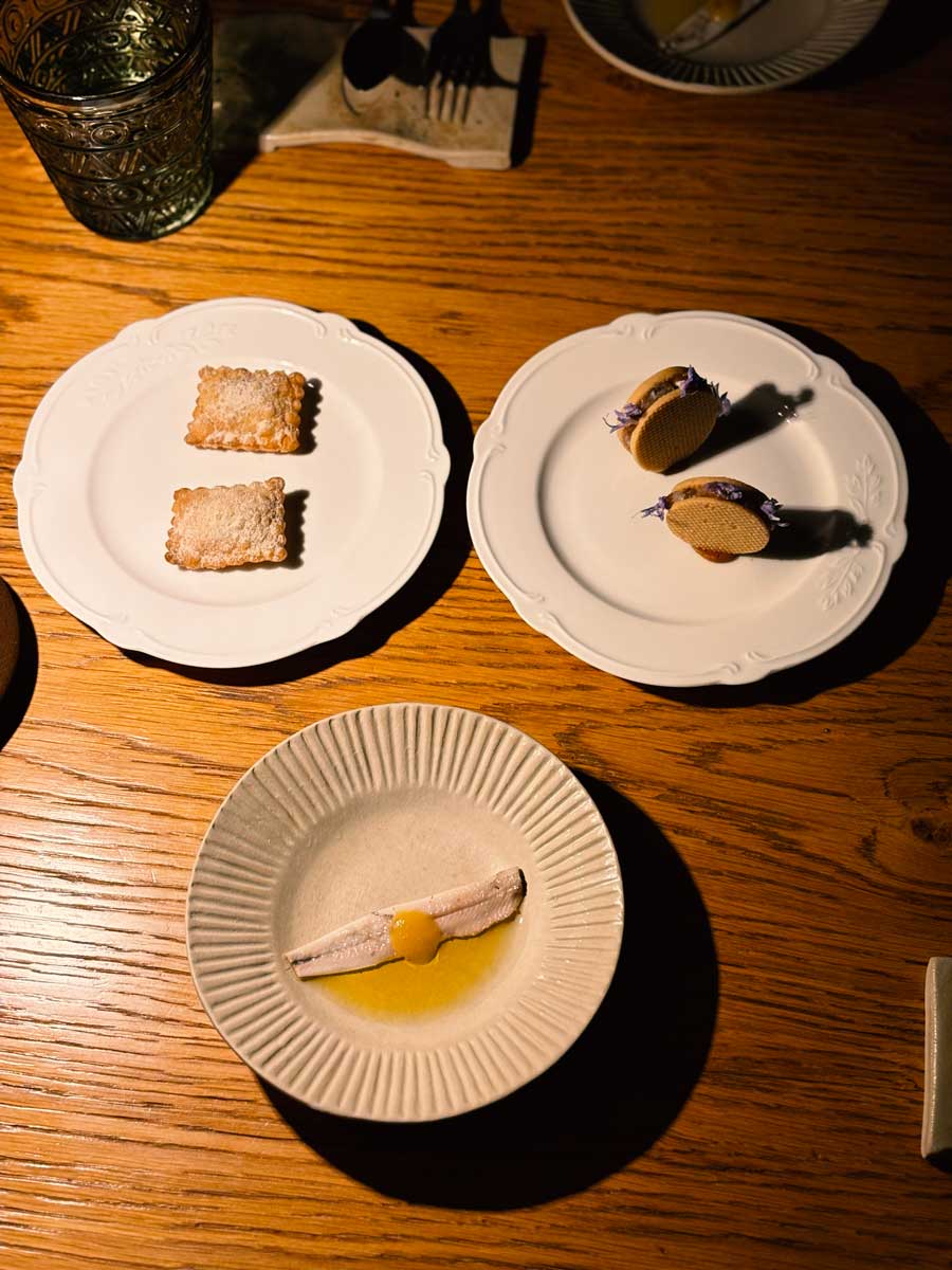 Pozdravi iz kuhinje su počeli autoritativno i moćno. Inćun s narančom predstavio je lijepu igru slatkasto-slanih okusa, dok je kroštula s gljivama bila prepuna toplih jesenskih nota. Keksić s tartarom od škombra je jednostavno briljirao. Poželjeli smo cijelu kutiju tih keksa.