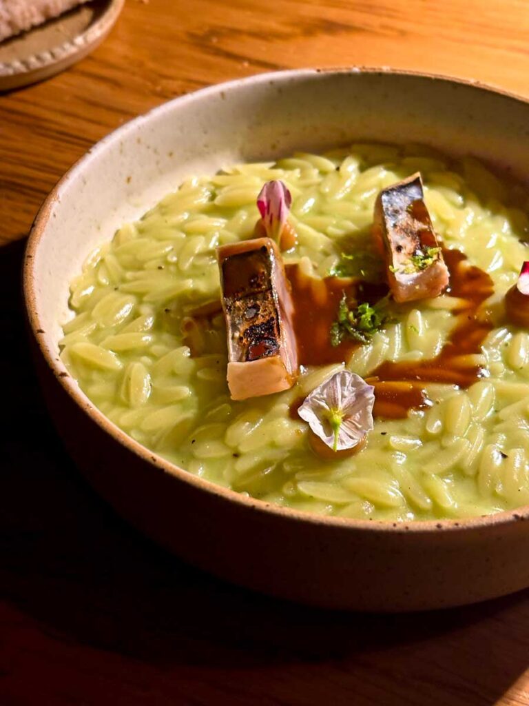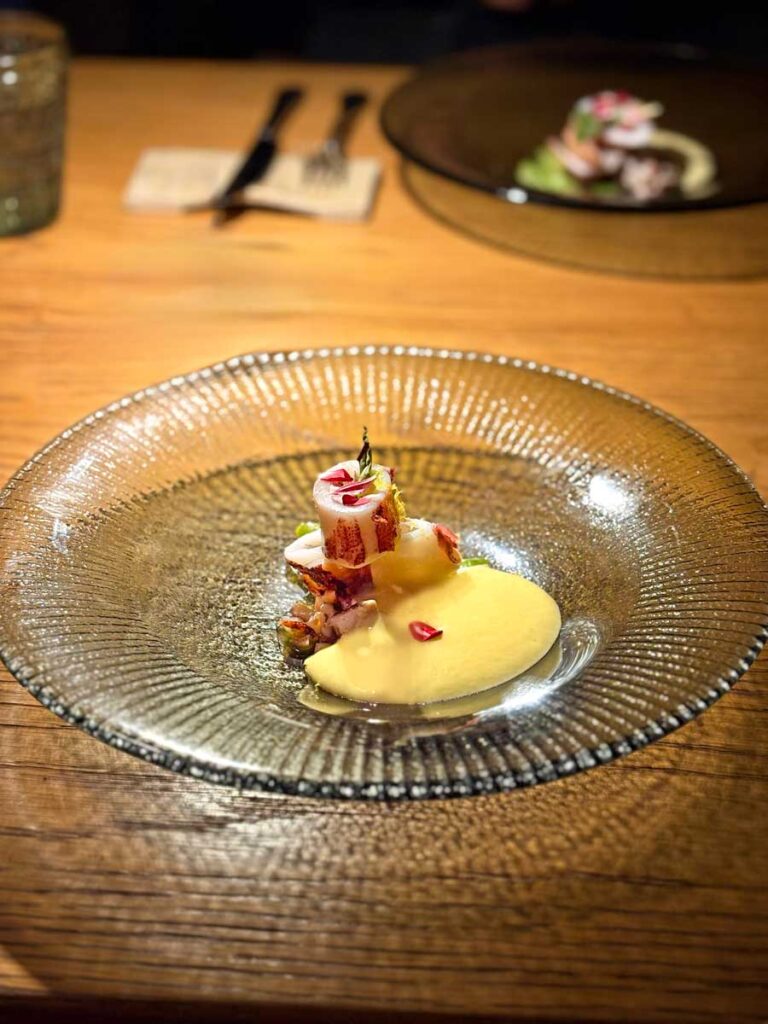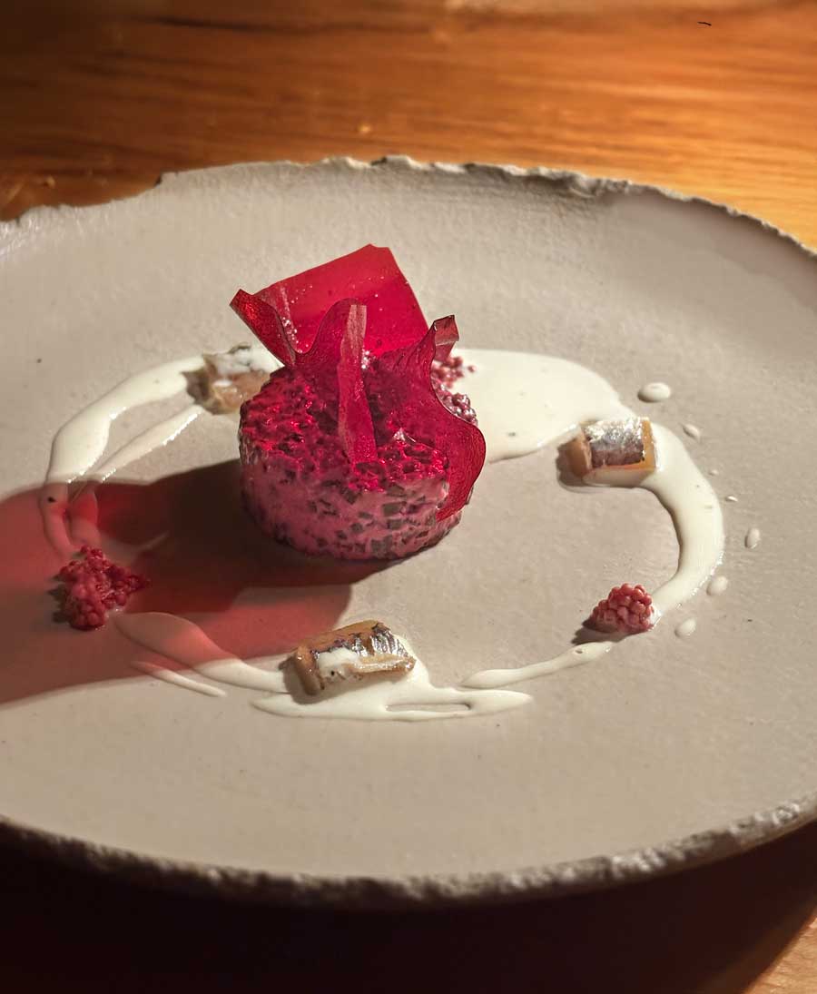Zijavičin tartar od cikle jedno je od najboljih jela od cikle koje smo dobili u hrvatskim restoranima. Nismo obožavatelji cikle i smatramo da je chefovi previše koriste u kuhinjama. Ali Vunićeva zadimljena cikla s umakom od srdela bila je fantastična, snažna i zaigrana. Risini sa škombrom, kremom od češnjaka i bisqueom od škampa bili su aromatični i višedimenzionalni zahvaljujući igri svježina, ublaženom češnjaku i delikatnom mesu nepretenciozne ribe. Gljive i kapesante su bile originalne i delikatne, a lignje s mahunama i hollandaise umakom odlične.