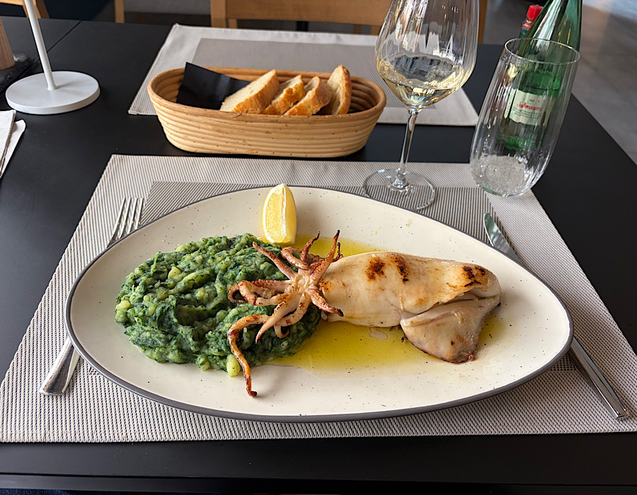 Naručili smo jadranske lignje: velika je lignja bila fenomenalna, puna okusa, s mekanim tijelom i hrskavim krakovima, jedna od najboljih ove godine. I krumpir s blitvom bio je vrlo dobar: krumpir je bio mekan, kao što mora biti, a blitva je ostala lijepo zelena, ne onako vodenasta i prekuhana kao u većini hrvatskih ribljih gostionica.