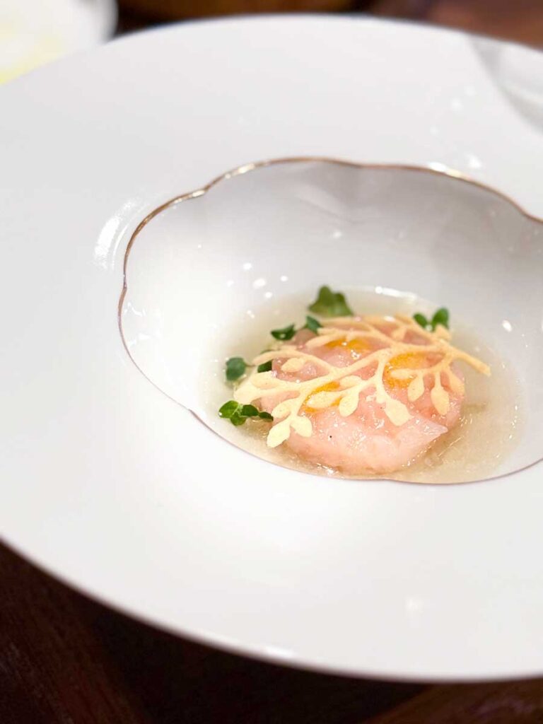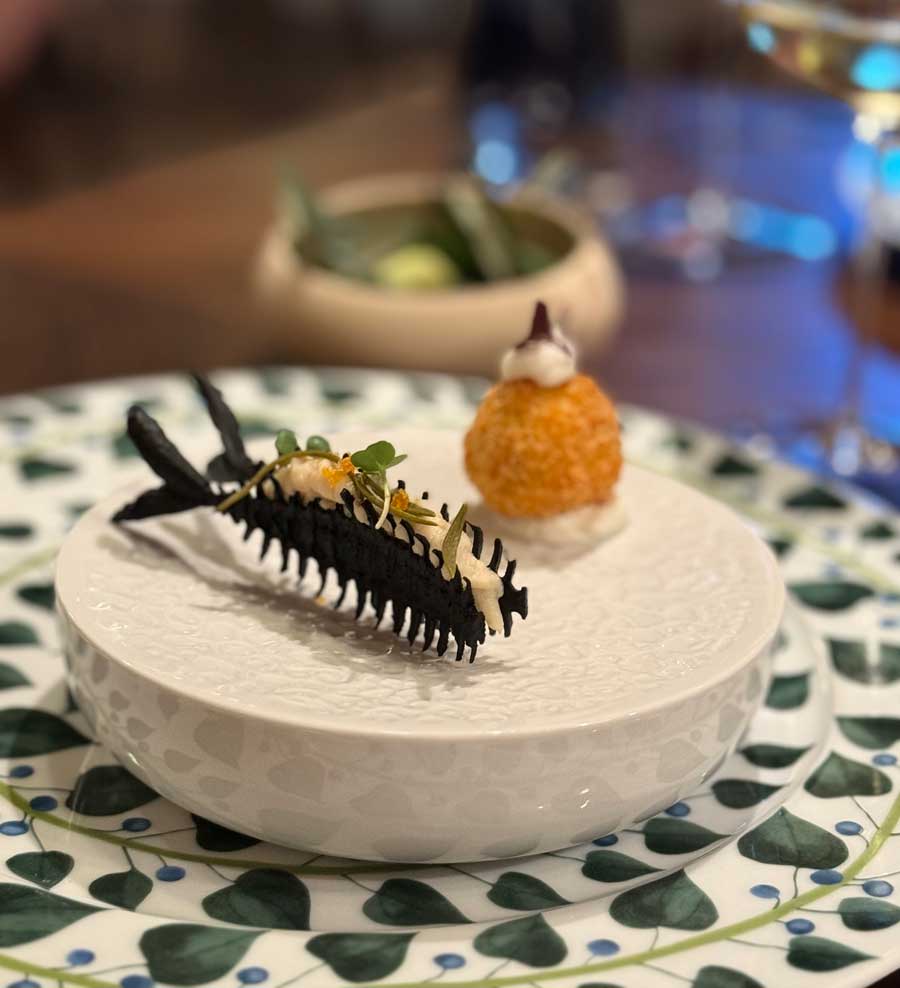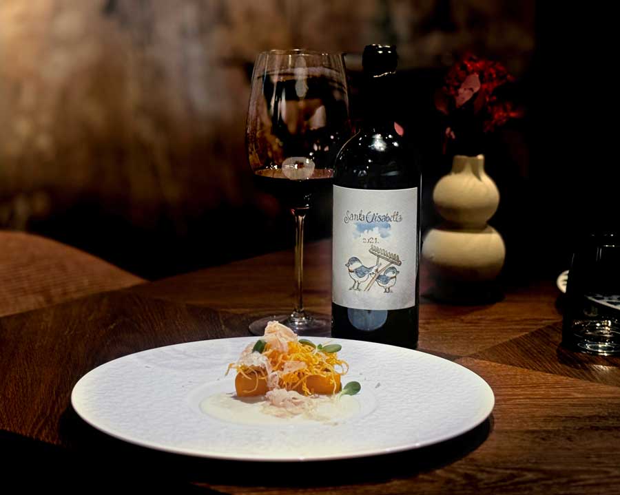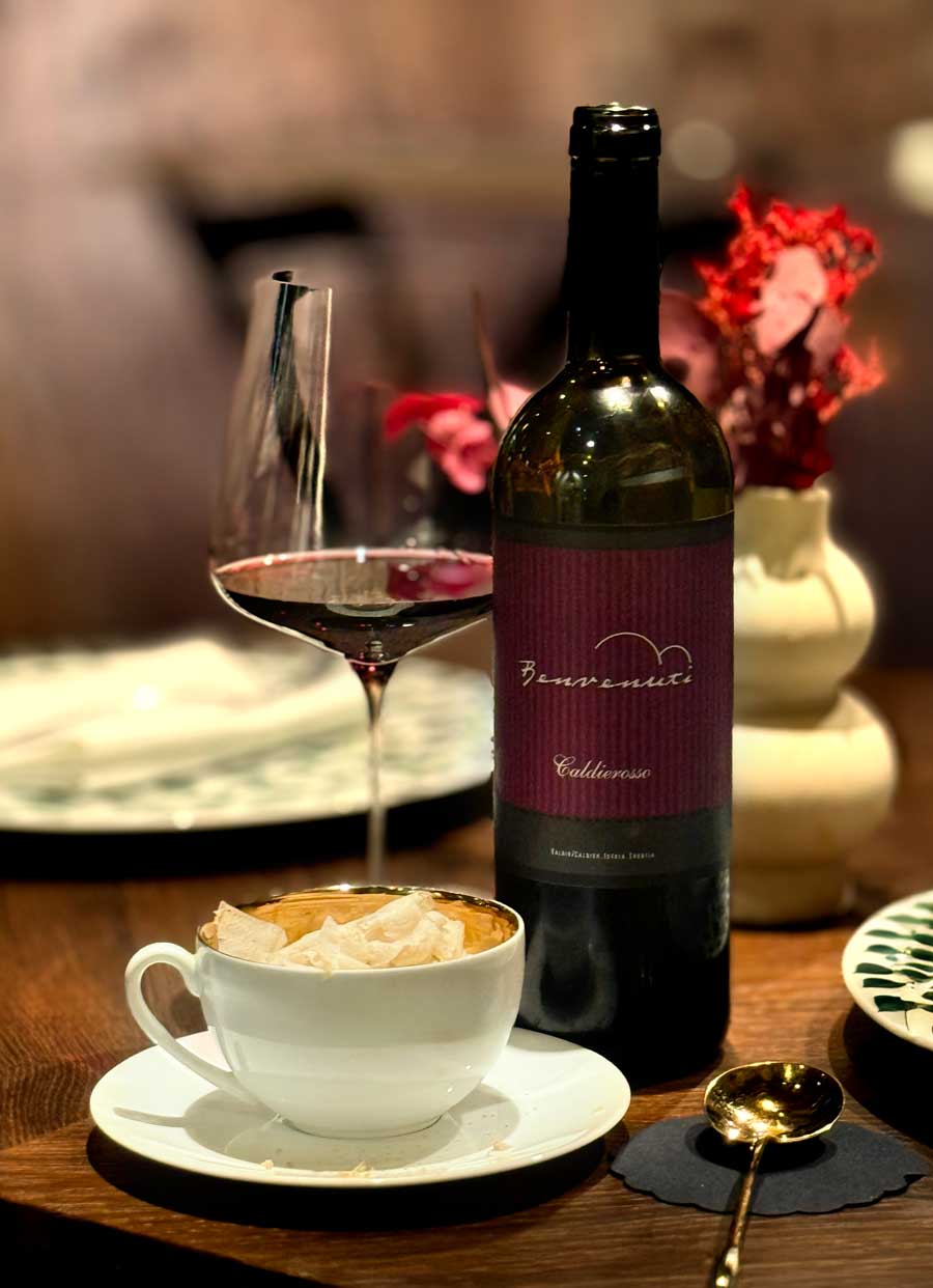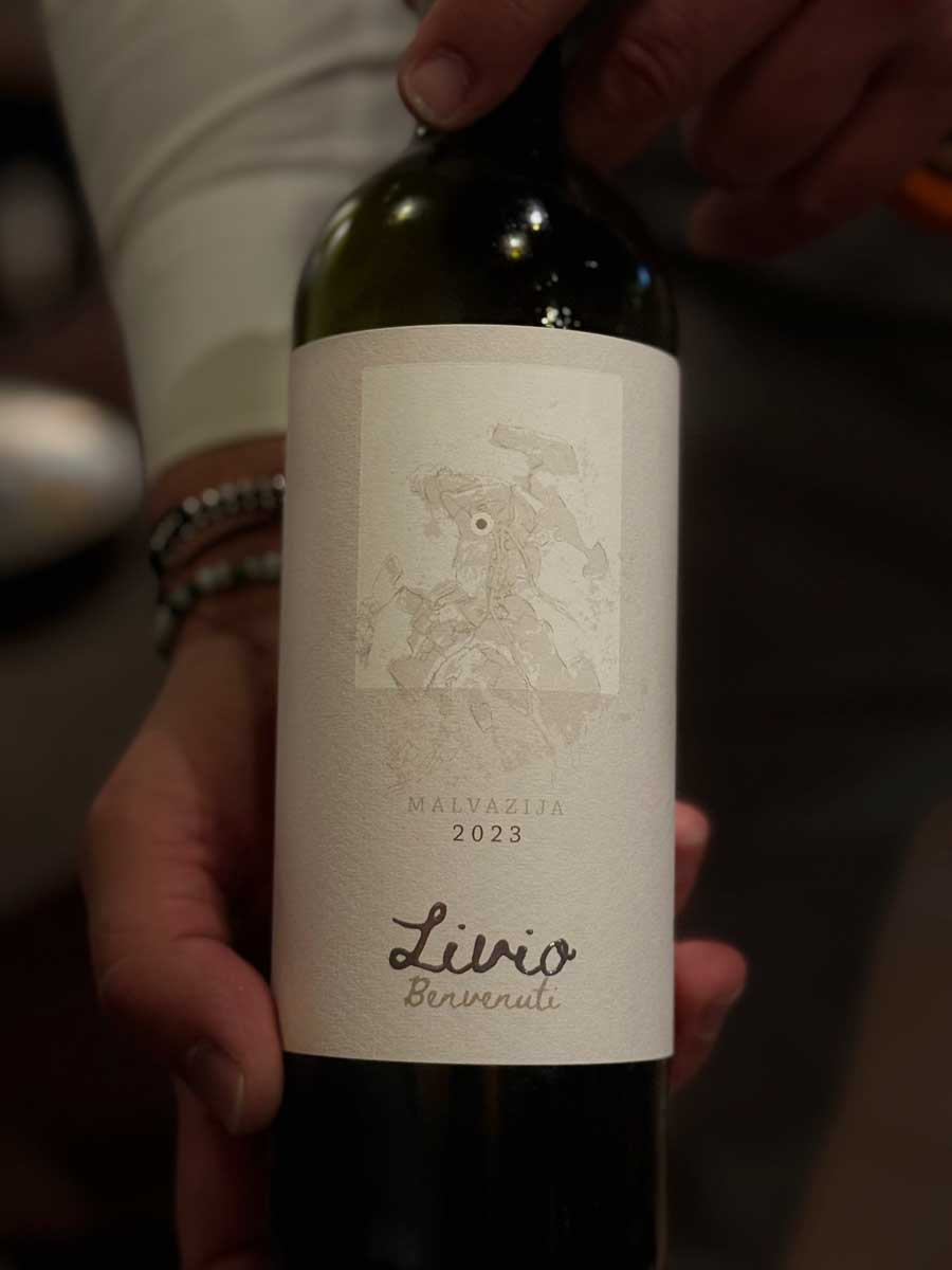 Uz odličan jesenski ručak posvećen bijelim tartufima, koji je završio izvrsnim, prozračnim desertom od kestena, pili smo nekoliko vina motovunske obitelji Benvenuti. Malvazija Livio iz 2023. neočekivano je dobro pratila jakovske kapice s tartufima. Načelno govoreći, ne volimo točiti malvazije uz tartufe, jer su tartufi presnažni za veliku većinu nemaceriranih bijelih vina. Međutim, jakovske kapice i treviso pomogle su inače izvrsnom Liviju u ovom nekonvencionalnom wine pairingu. Zatim smo kušali crni cuvée Caldierosso, sočno, voćno, ali ozbiljno vino s profesionalnim integritetom.