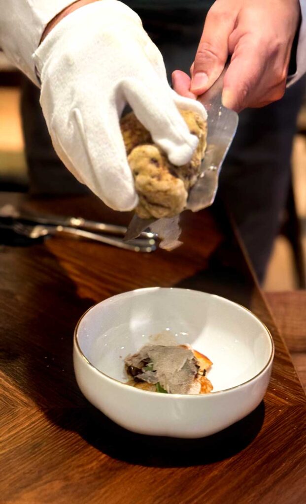 Bijele tartufe jučer smo jeli u djelomično netipičnim kombinacijama. Za početak smo, primjerice, naručili novigradske male, ali slatke jakovske kapice na kremi od graha s grilanim gorkim trevisanom. Tartufi su ovom precizno složenom predjelu dali specifičan sezonski naglasak.