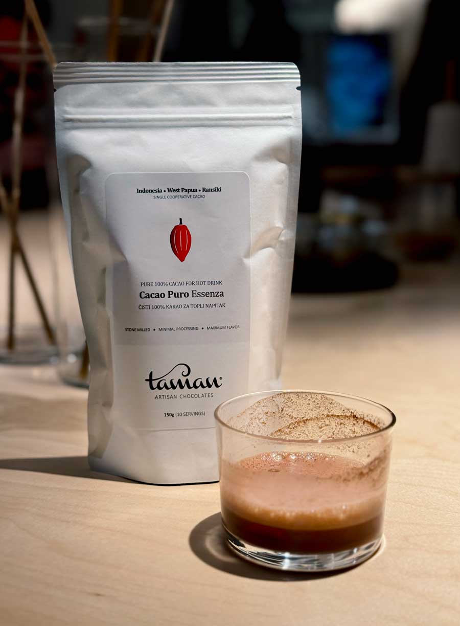 Vladović i Kahlina najavili su i nove verzije, od drugih vrsta kakaovca. Prva Cacao Puro Essenza napravljena je od mješavine Trinitaria, Forastera i Amelonada s obnovljene farme u regiji Ransiki u Zapadnoj Papui. Indonezija zadnjih godina obnavlja niz zapuštenih farmi, kako bi spriječila deforestaciju, digla ekološki standard i poboljšala uvjete života u ruralnim područjuma. Taman proizvodi i bean-to-bar čokoladu od kakaovca iz Ransikija, koja ima nešto drukčiji karakter od napitka: kiseline i slatkoća su izraženije, kao i cvjetno-voćne note, slatki začini, posebno muškatni oraščići karakteristični za ovaj pitomi, lijepi kakaovac. Cacao Puro Essenza najsmjeliji je proizvod od kakaovca koji trenutno možete kupiti u Hrvatskoj. I najzanimljiviji.
