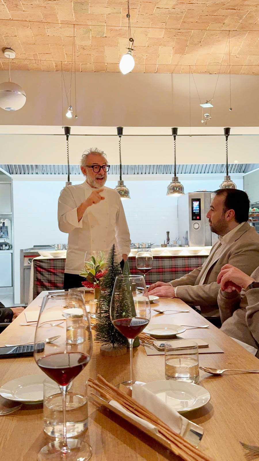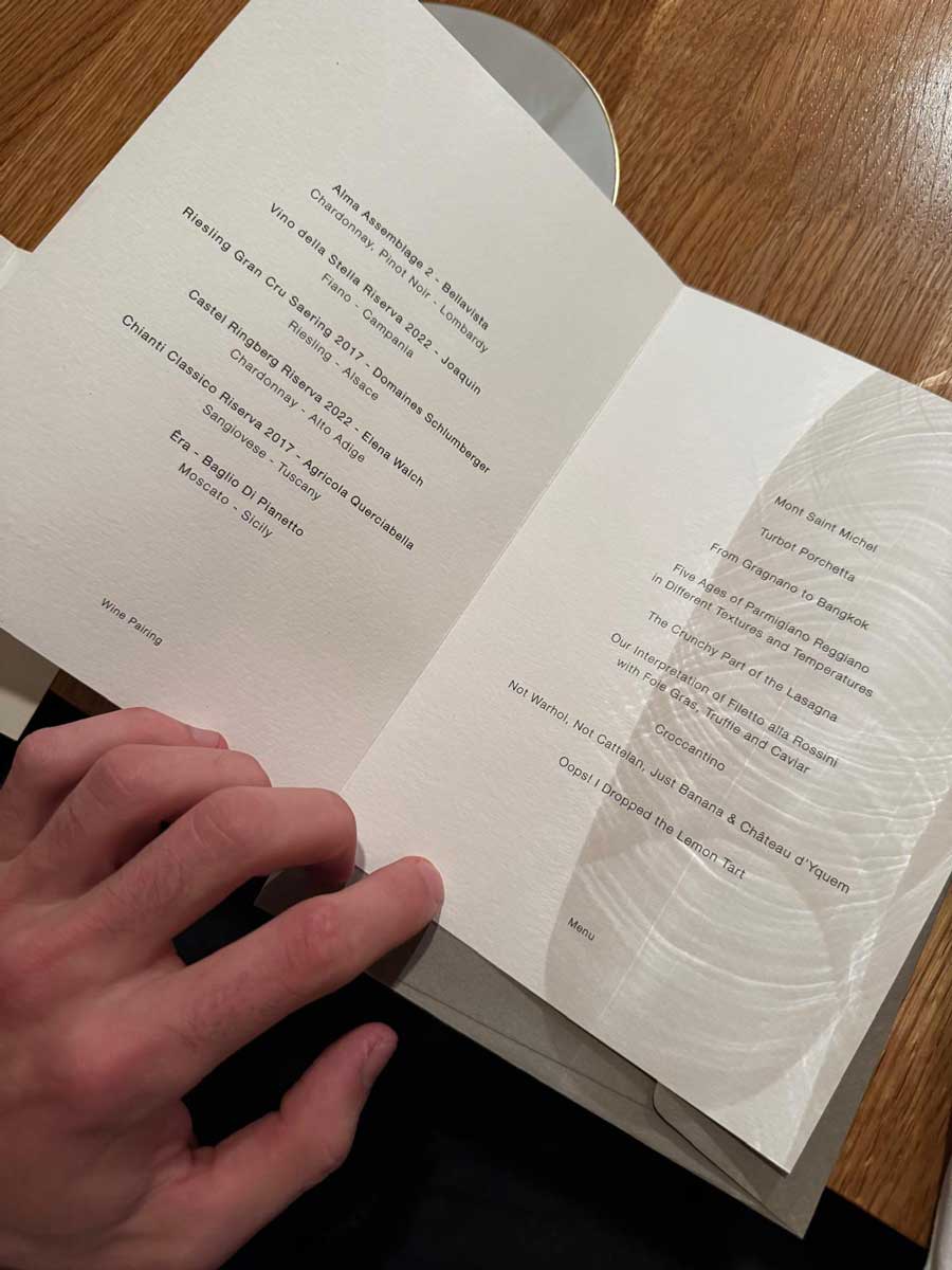 Meni se sastoji od Botturinih klasika, poput Pet tekstura parmezana, bifteka Rossini pojačanog tartufima i kavijarom i slavnog deserta pod imenom Ups! Ispala mi je pita od limuna. Vlasnik Ville Nai bio je oduševljen večerom, koju je u otvorenoj kuhinji pripremao osobno Massimo Bottura. Pouka je jasna: možete postati najbolji jedino ako se stalno, uživo, oduševljavate najboljima u svom poslu.