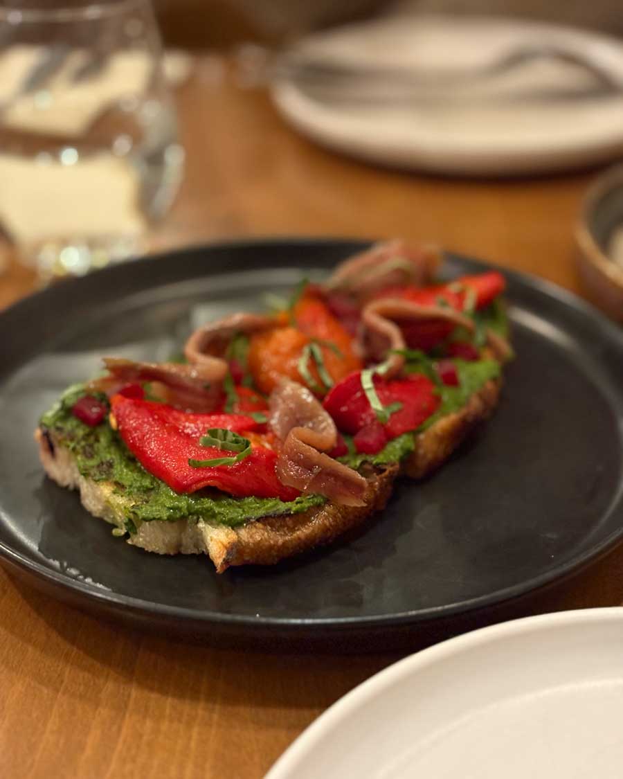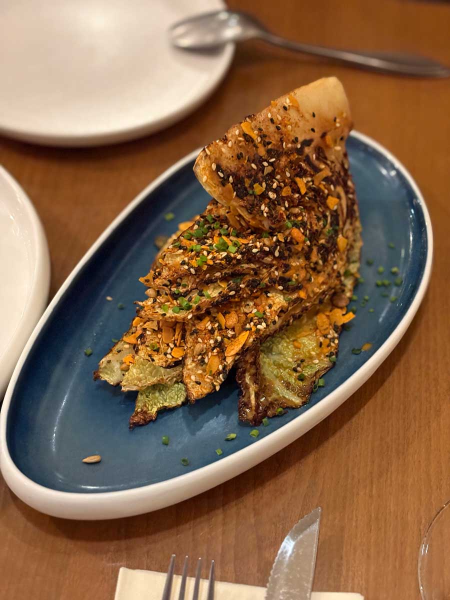 Slično je bilo i s bruschettama sa zelenom salsom, paprikom i inćunima. Jelo je bilo donekle naporno jesti, iako sastojci u teoriji funkcioniraju zajedno. Ostala jela su već bila bolja. Zapečeni kimchi kelj je trenutno najbolje jelo u novom Hiddenu. Kelj je također bio začinjen dukkhom, koja mu puno bolje odgovara nego tartaru.