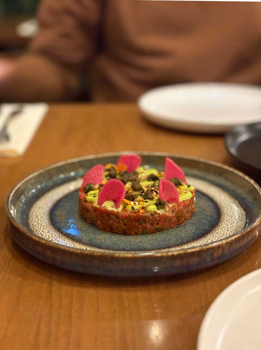 Međutim, s ovim jesenskim jelovnikom Hidden je napravio korak unatrag što se tiče uzbudljivosti i prezentacije. Počnimo s tartarom. Tartar je oduvijek bio Hiddenova podloga za kreativne sezonske varijante. Hidden je uvijek radio neke od najukusnijih i najoriginalnijih tartar biftek au Hrvatskoj. Sinoć nas je tartar razočarao. Iako je bio zanimljivo začinjen dukkhom i umakom od estragona, nedostajalo mu je svježine i imao je tupast okus.