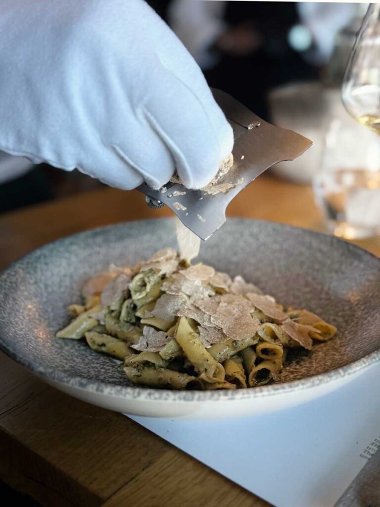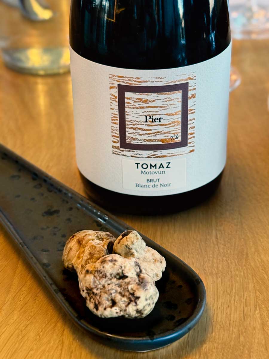 Treće, gastronomska ponuda složena je prilično inteligentno: kreće se od klasičnih daskica koje mora imati svaki vinski podrum, preko masovnih favorita poput kozica u panku, do nekoliko malih ali serioznih jela, kao što je janjetina s tartufima. Mi smo, kao bonus izvan redovne ponude, dobili i odlične fuže s prvorazrednim bijelim tartufima. Majka Klaudija Tomaza tartufe je ubrala u subotu ujutro u Motovunskoj šumi. Vinarija Tomaz u Motovunu u prvih osam mjeseci ove godine zabilježila je 37 posto veći promet nego u cijeloj lanjskoj godini. Riječ je, uistinu, o fascinantnom uspjehu.