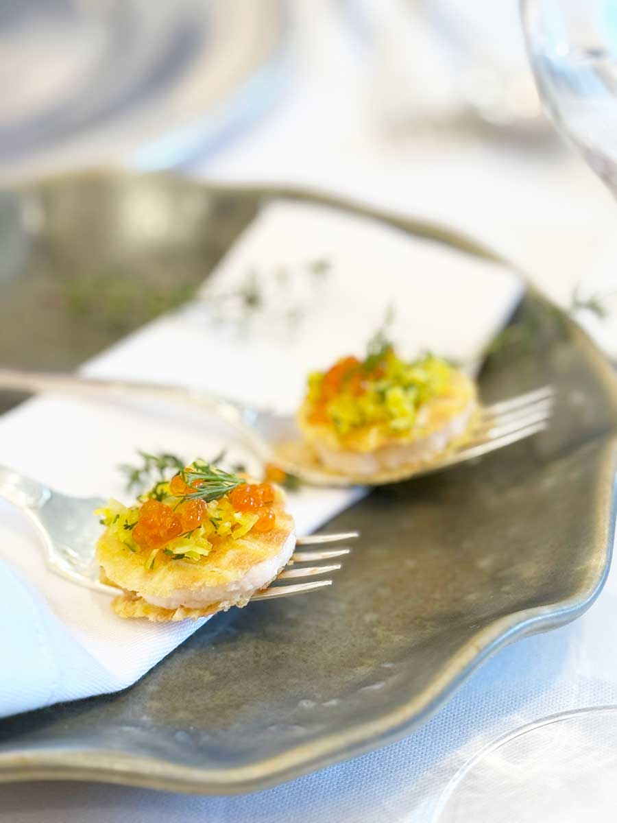 Za predjela smo naručili poširane kamenice sa shisom i listom biljke kamenice, radikalno mineralne, ali dramatično ukusne. Martina Tomac odlučila se za bogati bisque jodiran triljom, a Tomislav Tomac za klasični rižoto sa škampima i ribanim svježim crnim tartufima.