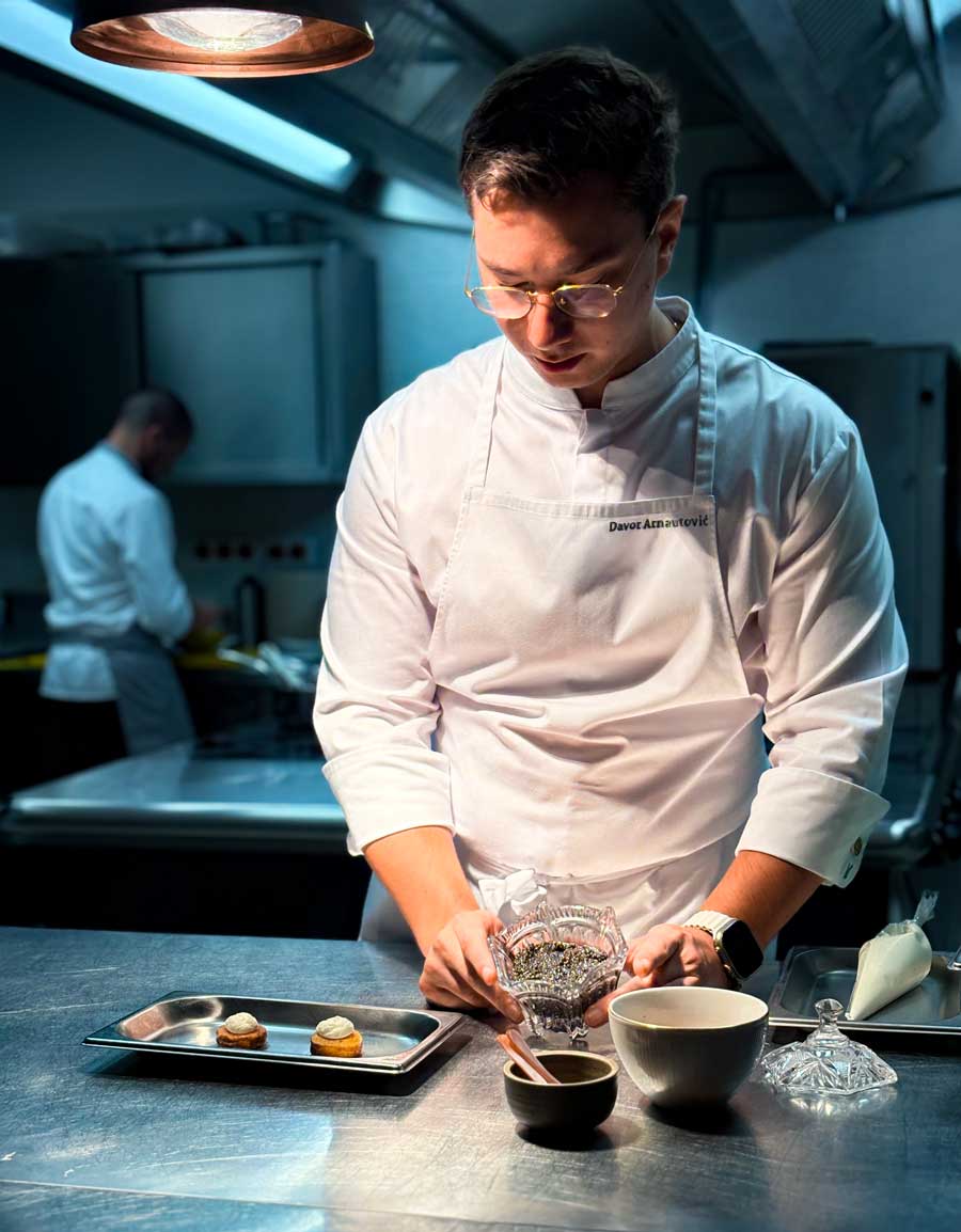 Davor Arnautović radio je nekoliko godina u Austriji, zatim u paškom Boškincu, dubrovačkom 360 i slavnom El Celler de Can Roca, prije nego je prvi put preuzeo kuhinju spektakularnog novog hotela Vila Muhr u Bohinju. Arnautović i Vila Muhr opredijelili su se za čistokrvni fine dining i dobro uzdrmali uspavanu slovensku scenu. Arnautović kuha s puno poštovanja za mjesto u kojem se nalazi, rigorozno bira namirnice, a njegova su jela hedonistička, ukusna, striktno lokalna i sezonska i zaigrano luksuzna.