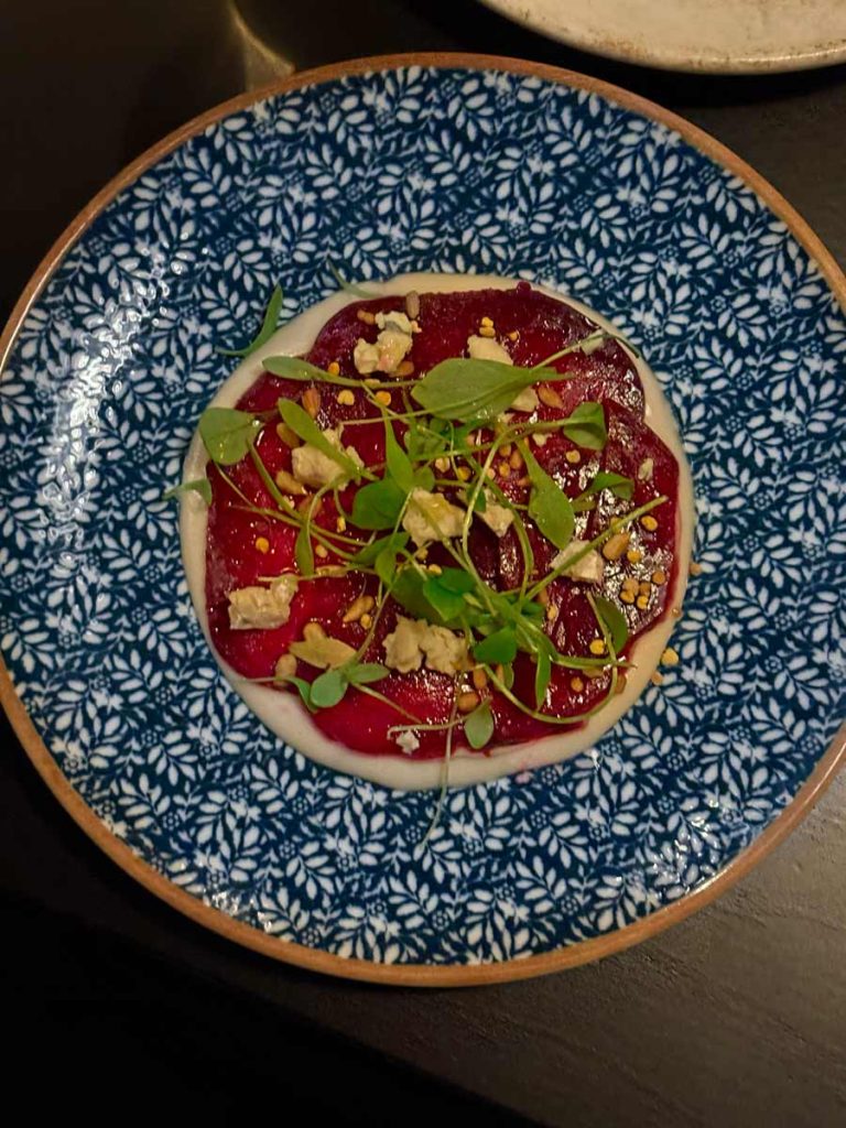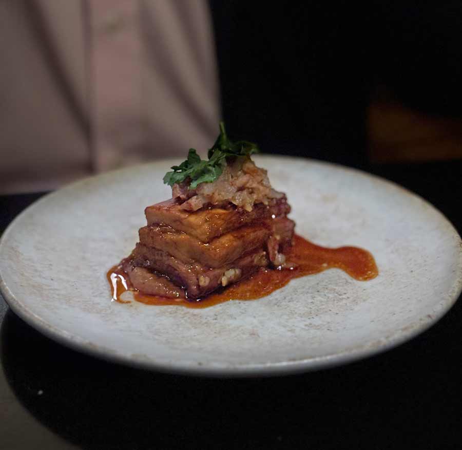 Nakon tartara dolazi dashi od karameliziranog luka s pečenom bundevom i kovrčavim keljom, intenzivan, okrepljujuć i pun umamija, dugo grilana cikla dobar je suigrač fantastičnom kremastom tahiniju kojem su dodatni sloj dali  plavi sir i suncokretove sjemenke. Krumpir pripremljen tehnikom rižota sa ribljim temeljcem, lignjama i limetom jedno je od mirisnijih jela koje smo probali u zadnje vrijeme,  dok je glavno jelo,  dugo kuhana svinjska potrbušinu u kojoj se sva mast rastopila zajedno sa jusom od pečenja, daikonom i čvarcima, briljantno završila slani dio jelovnika.