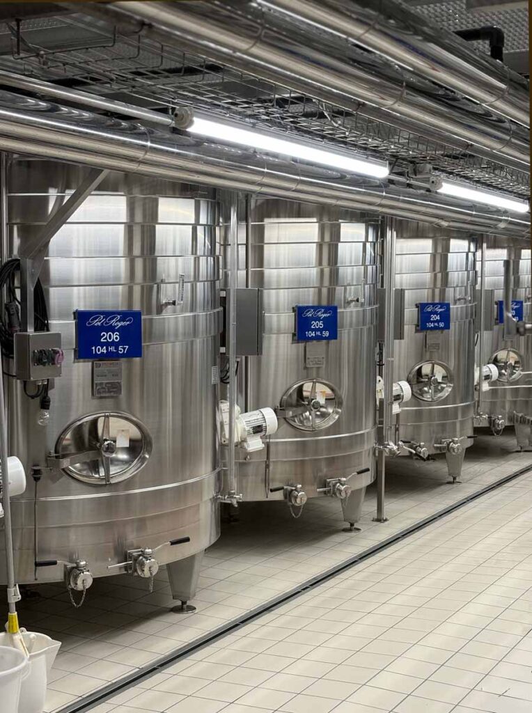Pol Roger šampanjce odležava samo u inoksu i proizvodi nešto manje od 2 milijuna butelja godišnje, što ih svrstava među veće proizvođače ali ne i najveće. Nakon što smo prošli kraj velikih inoks tankova, spustili smo se tridesetak metara pod zemlju u desetak kilometara duge podrume Pol Rogera. U njima odležava nekoliko  milijuna buteljki, od kojih su mnoge još iz prošlog tisućljeća. Najstarije koje smo uočili bile su iz 1973. godine.