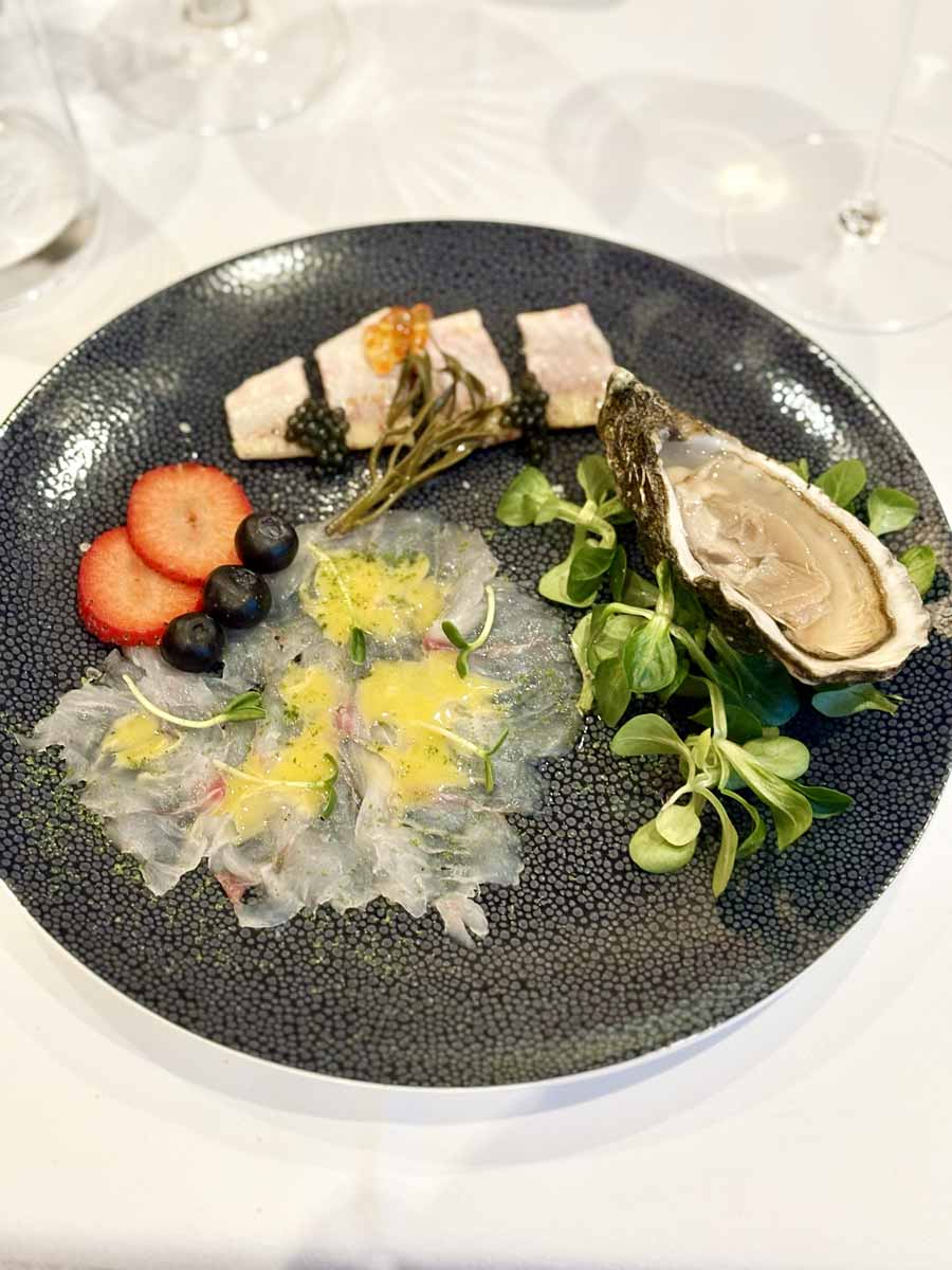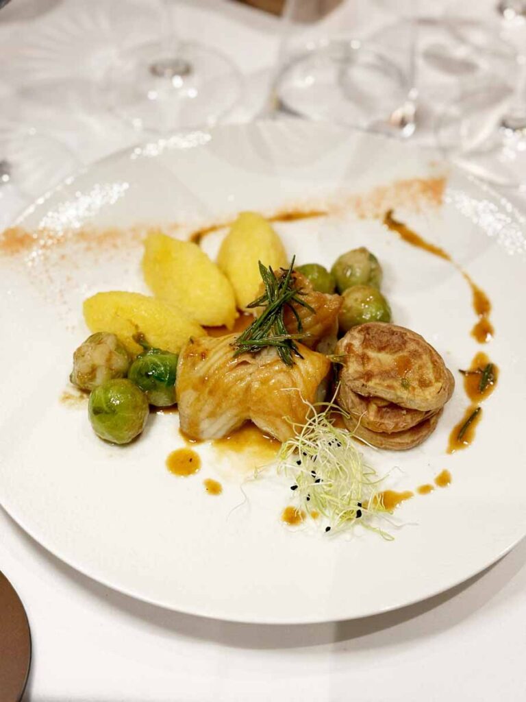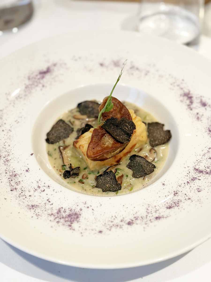 Zatim su na stol došla hladna predjela, jedno mesno i jedno riblje. Kamenica iz Bretanje je bila solidna, carpaccio od brancina jako dobar, a trilja odlična. Mesni dio je sadržavao fini ručno rezani pršut krčke kuće Gospoja, užitan punjeni carpaccio sa skutom, odličan roastbeef i paštetu. S hladnim predjelima dobili smo i veoma dobra domaća peciva koja nismo mogli prestati jesti. Rimski njok s foie gras i svježim tartufima bio je najbolje jelo, s tehnički korektnim umakom od shiitake gljiva, ukusno začinjenim foie gras i uzorno pripremljenim njokom.