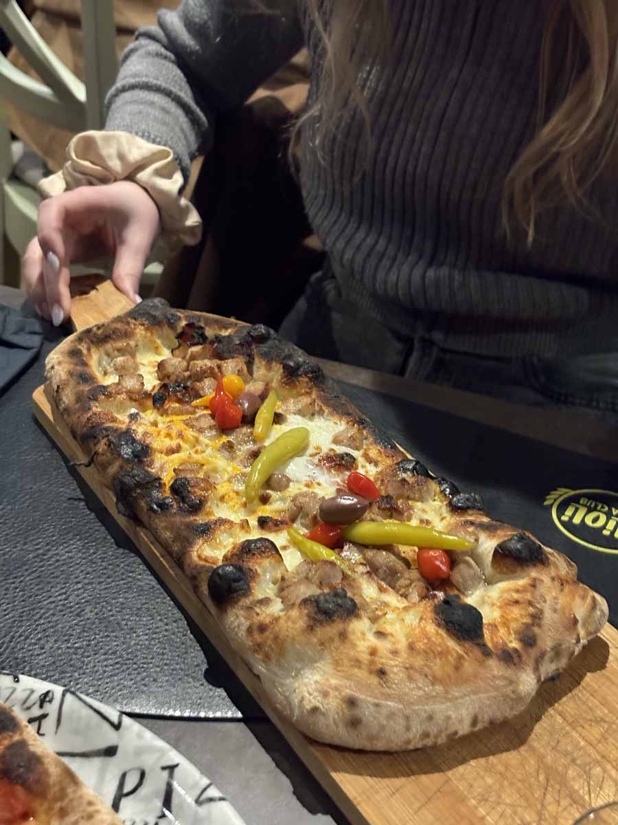 Oli Oli je zapravo pastrmajlija s komadićima svinjskog vrata, guancialea, jaja i propisno ljutog feferona. Pastrmajlija je bila jako ukusna i zanimljiva, s bogatim punjenjem i svakako je preporučujemo. Ostala jela nisu baš privlačna. Oli Oli još nudi i pašte koje se stavljaju u košarice napravljene od pizza tijesta, u svima se koriste vrhnje za kuhanje ili tartufata. Bez ozbira na sve, Oli Oli je u utorak poslijepodne bio pun. Račun za dvoje smo platili 30 eura.