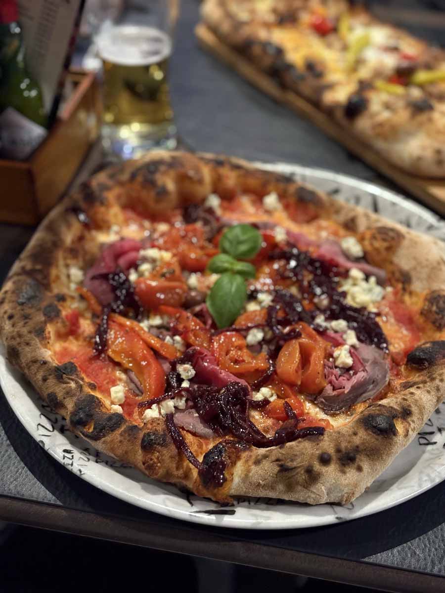 Tijesto je prilično hrskavo, pomalo zgusnusto ali dovoljno lagano pa mu se ne može previše zamjeriti zbijenost. Naručili smo pizze Luda Mara i Oli Oli. U Ludu Maru idu roastbeef, pečene paprike, karamelizirani luk, gorgonzola i navodno vino Luda Mara makedonske vinarije Tikveš. Kad smo upitali osoblje gdje ide vino u pizzu dobili smo samo šturi odgovor “unutra”. Prilično smo sigurni da ga u umaku nije bilo, jedino što nam ostaje za pogoditi jest da je vino u karameliziranom luku, ali kad bi kuhinja Oli Olija koristila takvu metodu karameliziranja luka ona bi se morala koristiti u jako malim količinama za koju zaista ne bi bila potrebna reklama Lude Mare vinarije Tikveš. Usput rečeno zaista je čudno koristiti Ludu Maru u kuhanju a ne staviti je na vinsku listu, koja je općenito loša.