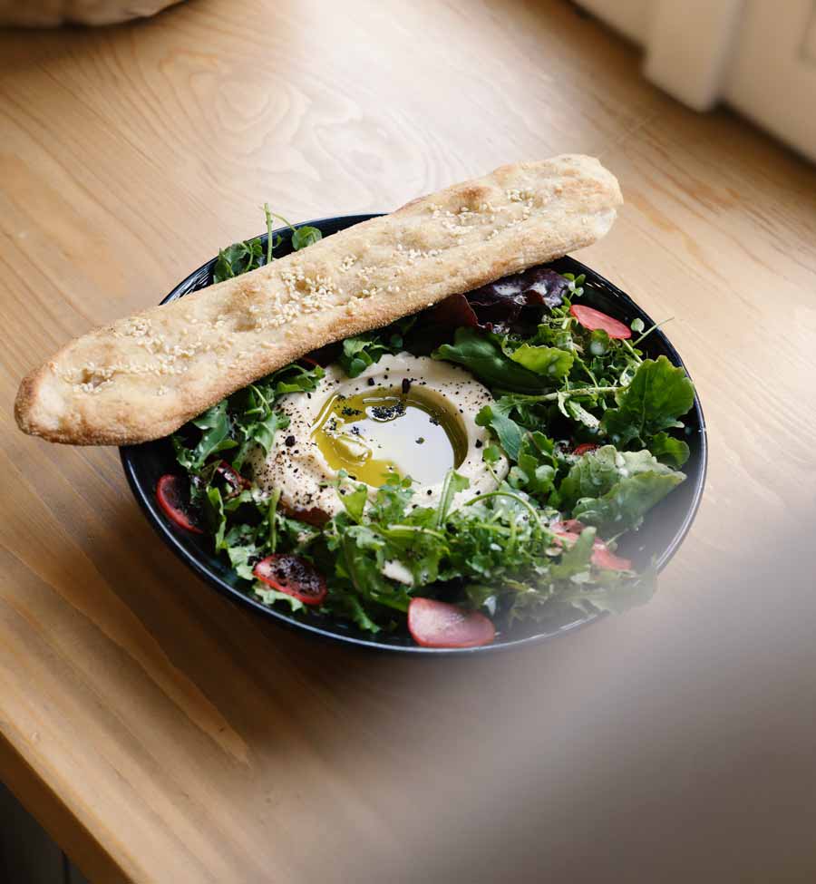 Azijom je inspirirano i najosebujnije novo jelo na meniju: nabrijana aromatična vijetnamska palačinka od rižinog brašna s jadranskim kozicama i lungićem, poslužena s domaćom salatom i Salovim dresingom. Humus od bijelog graha, staro Šakotino jelo koje usavršava još od Brokenshipsa, lagan je i nježan, napravljen bez češnjaka i začinjen garumom od bjelanjaka i istarskim maslinovim uljem Škabe. Dolazi se s izvrsnim Salovim flatbreadom i svježom salatom. Poširana jaja sa šunkom od svinja iz organskog uzgoja poslužuju se na slanim salenjacima sa salatom.