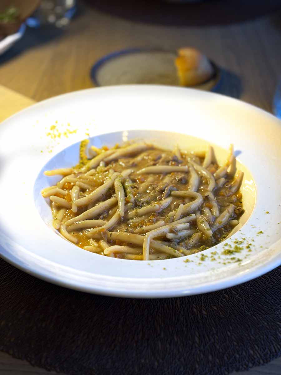 Nakon light predjela naručili smo pljukance s telećim raguom i svinjske obraze. Teleći ragu je bio neusporedivo bolje jelo iako nije bez konceptualnih mana. Pljukanci nisu najsretniji odabir za ragu, jer se ragu slijevao s njih. Cijelo jelo su izvukli lijepo al dente kuhana pašta i dobar okus telećeg ragua. Svinjski obrazi su pak bili amaterski. Obrazi crne slavonske svinje, termički obrađeni u sous videu, ostali su suhi, a jelo je bilo premasno. Frika od krumpira je bila mrvicu prepečena i prelivena mesom s umakom pa je postala gnjecava.