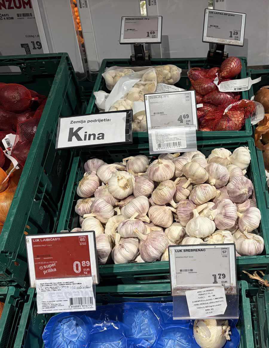 Češnjak, naravno, dolazi iz Kine. Ljubičasti luk iz Nizozemske, žuti luk iz Srbije i Italije, krumpir iz Italije, mrkva iz Srbije, salata kristalka iz Slovenije, brokula iz Italije, kivi iz Grčke, citrusi i grožđe iz prekomorskih zemalja, kao i egzotično voće. Na Konzumovim policama smo pronašli tek hrvatski kupus, zelenu salatu, začinsko bilje i možda mandarine i jabuke: kažemo možda, jer na mandarinama nismo jasno vidjeli oznaku porijekla.