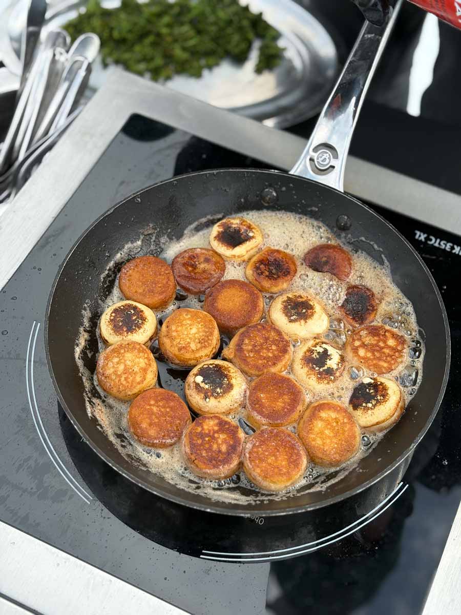 Chef Arnautović nas je dočekao u radnom izdanju u dosta teškim uvjetima. Refuli vjetra su otežavali posao, struja je nekoliko puta iskočila, a kuhati elaborirana jela na dvije indukcije i japanskom grilu za dvadesetak uzvanika nije nimalo lagan zadatak. Chef Arnautović je, međutim, u svemu ostao staložen i u kontroli. Pozdravi iz kuhinje su signalizirali visoke ambicije: Alpen kavijar s creme fraicheom i tartarom.
