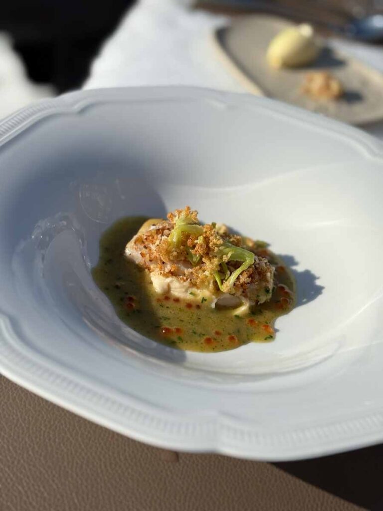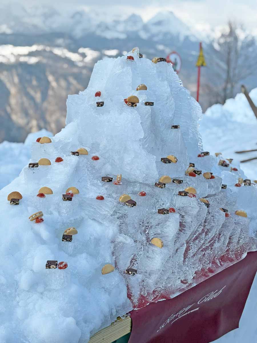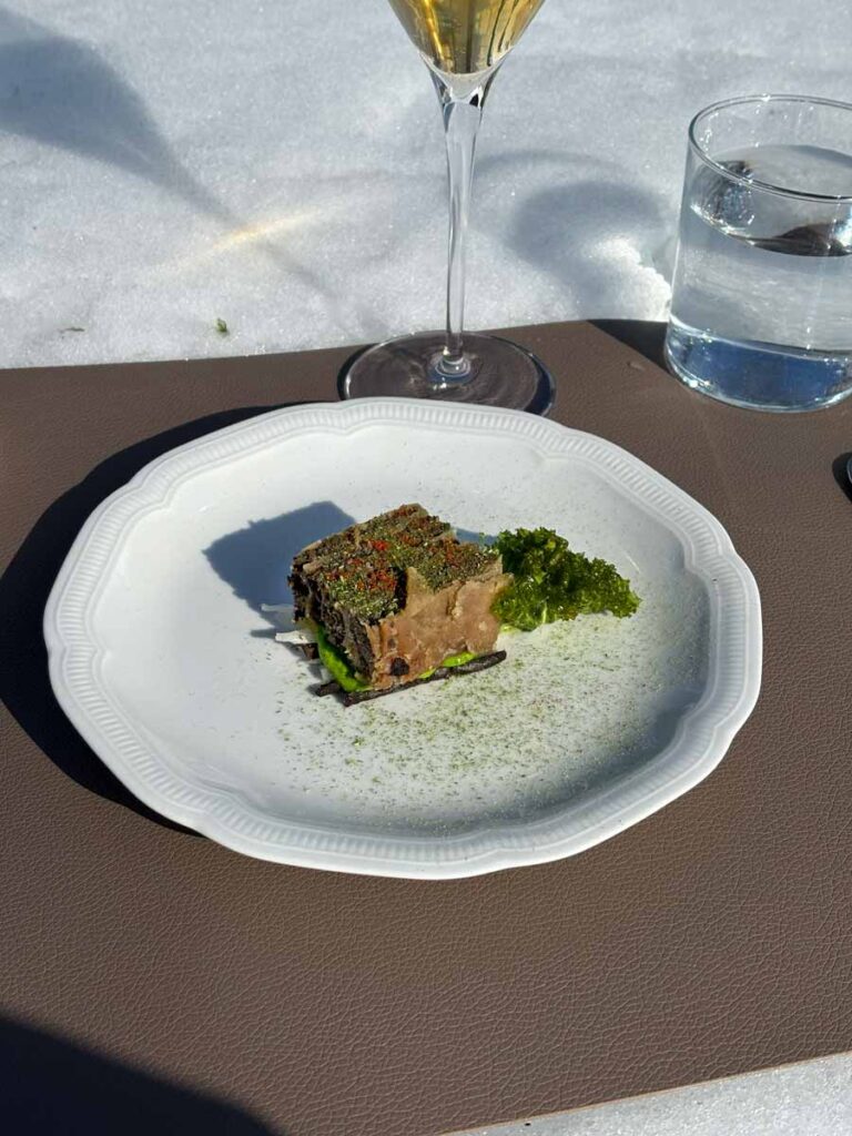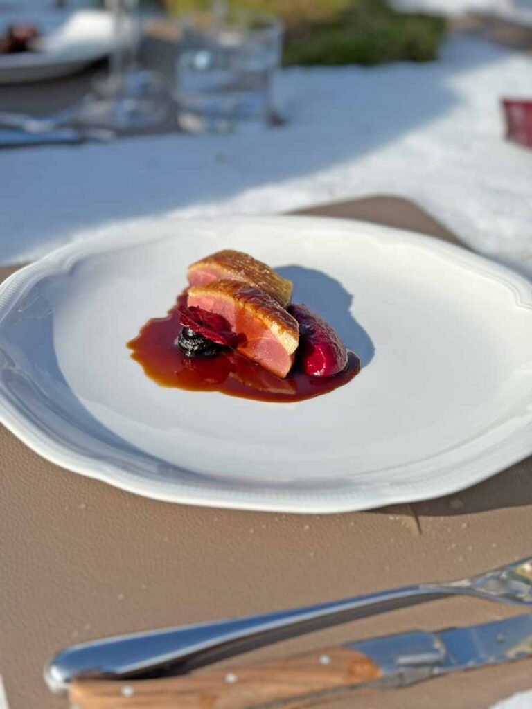 Za vina je bila zadužena vinska kuća Istenič, čiji su mlađi članovi točili pjenuščce. Prvi slijed je činila jako fina tortica u više formi kelja iz lokalnog uzgoja. Pastrva iz farme pastrva Zupan lijepo se spojila sa zelenim beurre blacnom i hrskavom cvjetačom. Glavni slijed, pačja prsa i razne forme cikle s crnim češnjakom su elegantno završile slani dio spektakularnog ručka na planini u kojem se vidjela stanovita darovitost mladog chefa Arnautovića. Dodatni lokalni štih dale su knedlice od šljive, dok su petit forsi dobili kreativni plating na ledenoj skulpturi.