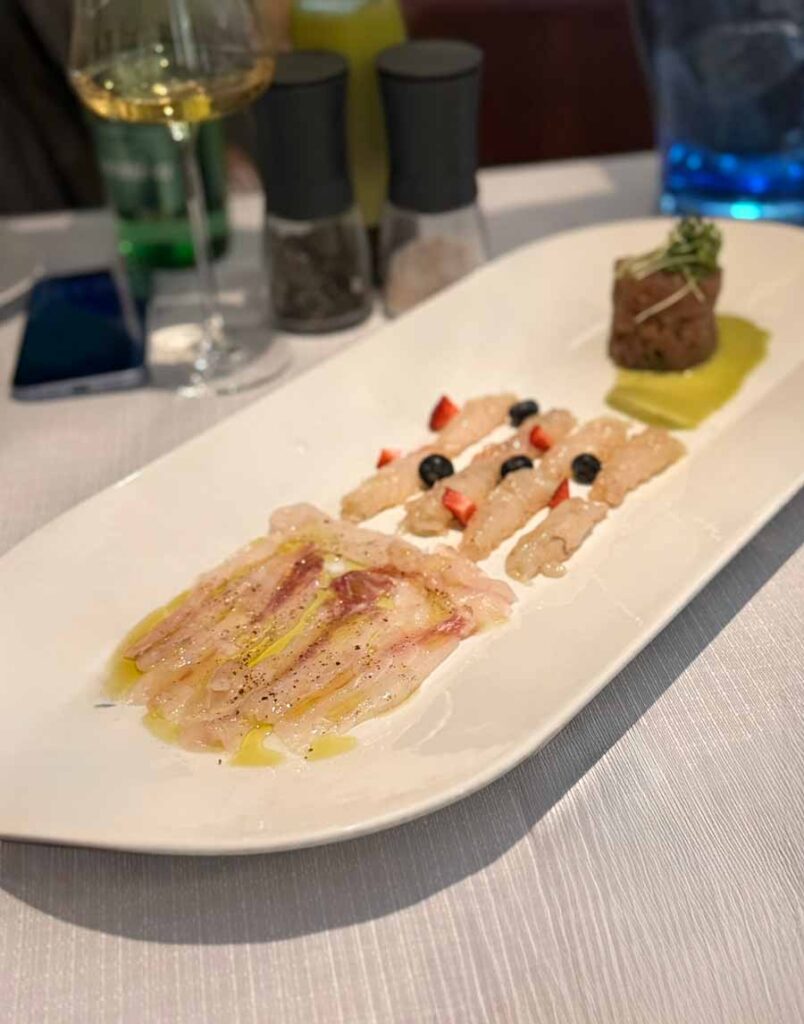 Umjesto veličanstvenog hlapa naručili smo niz malih ribljih predjela, koja su sva bila jednostavno ali geometrijski čisto servirana i vrlo precizno začinjena. Ni sirovi škampi ni carpaccio od brancina, ni tartar od tune kao ni tartar od miješane bijele ribe, nisu tražili ni zrno soli, ni prstohvat papra, ni kap maslinova ulja. Sve je već bilo na tanjurima, u perfektnim omjerima koji su podržavali specifične okuse ribe i rakova.