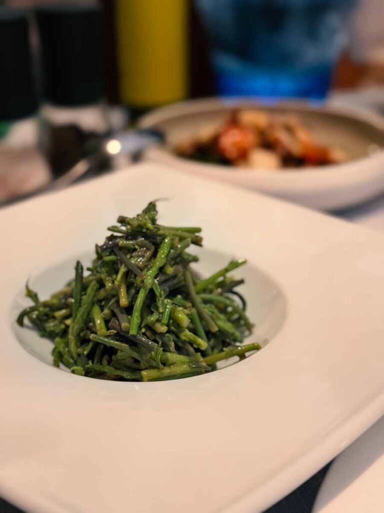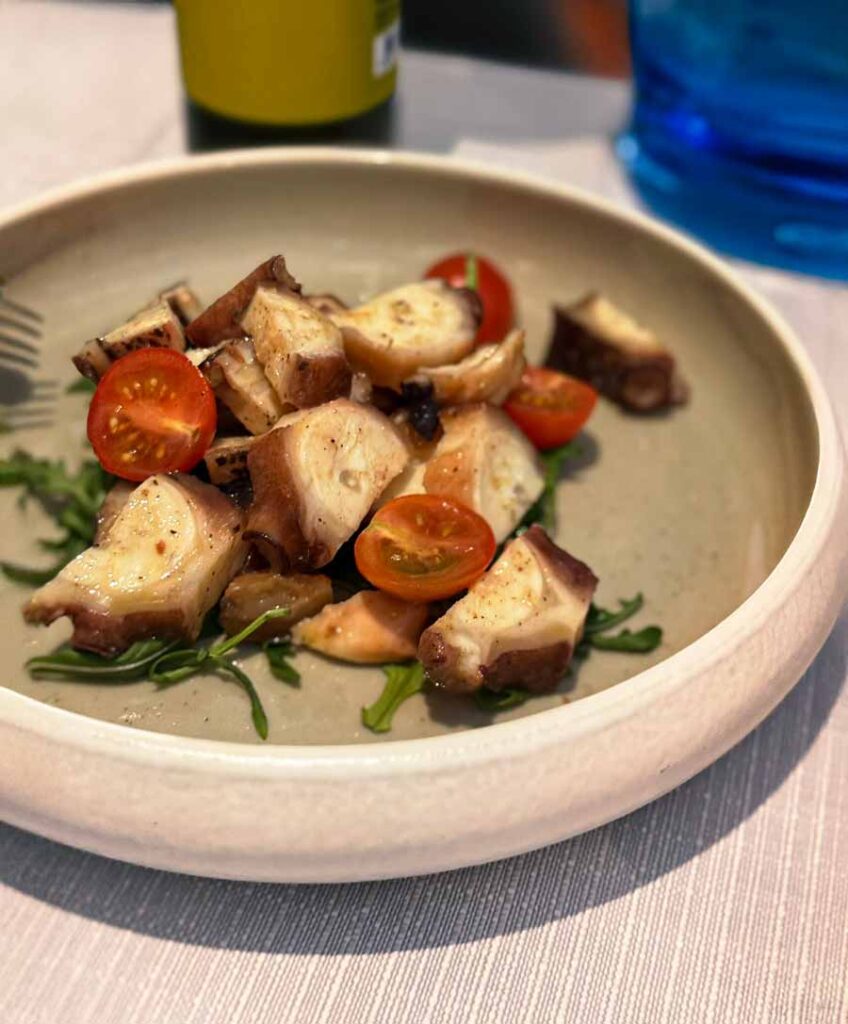 Salata od šparoga bila je osvježavajuće gorka, a salata od lokalne razmjerno rijetke hobotnice (više od 90 posto restorana koristi uvozne hobotnice) slasna, meka i distinktivna. Za glavno jelo donijeli su nam romba s gradela koji je bio raskošno želatinozan, gotovo putrast, prepun onog jedinstvenog slatko jodiranog okusa prvoklasnih plosnatica.