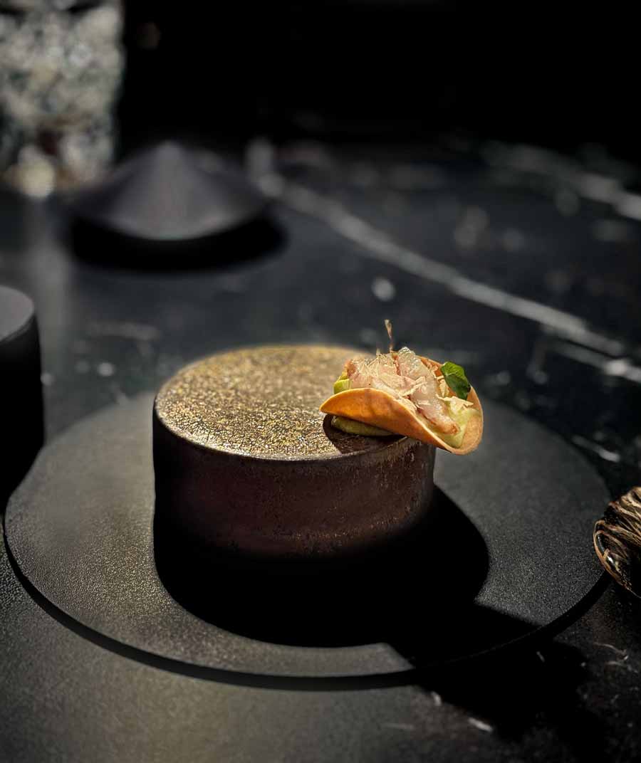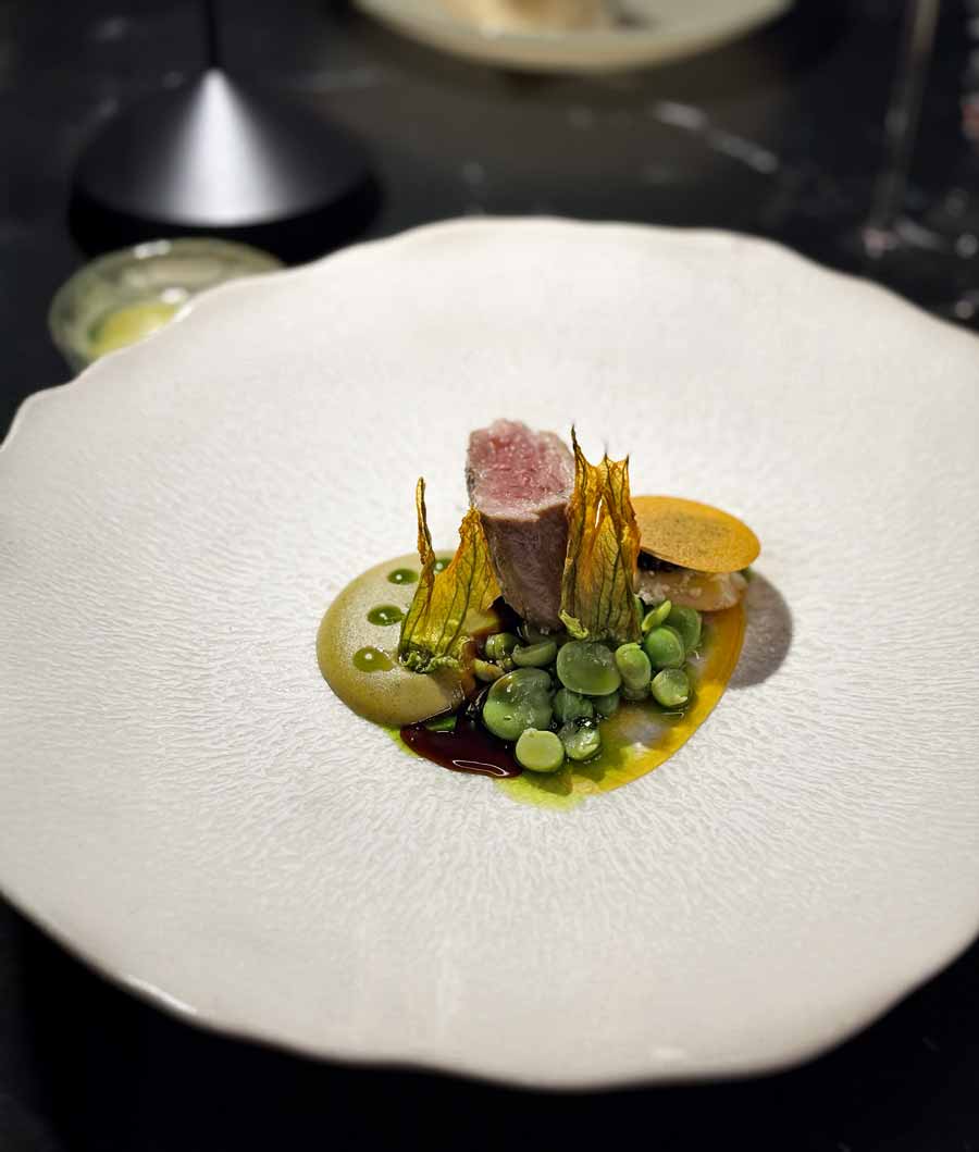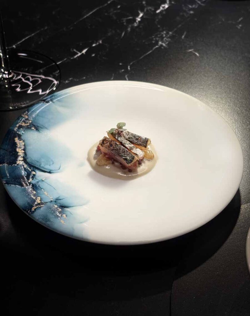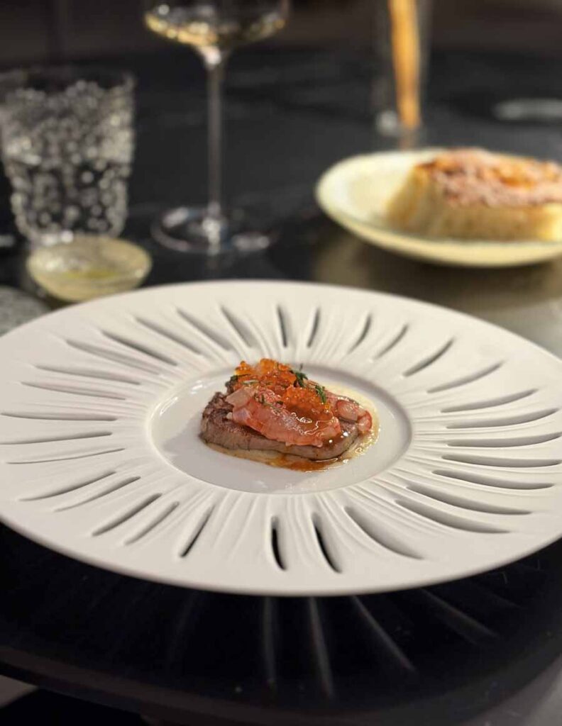 Večera je počela s lijepim izborom šampanjaca i pjenušaca. Pili smo Philipponnatov blanc de noirs iz 2019. godine i franciacortu Bellavista iz 2018. Zatim su na stol došli elegantni pozdravi iz kuhinje, među kojima su nam se najviše svidjeli mali taco s jeguljom i tunom i skuša na savor. Odlični su bili i krumpiri s kavijarom. Focaccia od kiselog tijesta jedan je od elegantnijih primjeraka u hrvatskim fine dining restoranima, dok je maslac fantastičan.