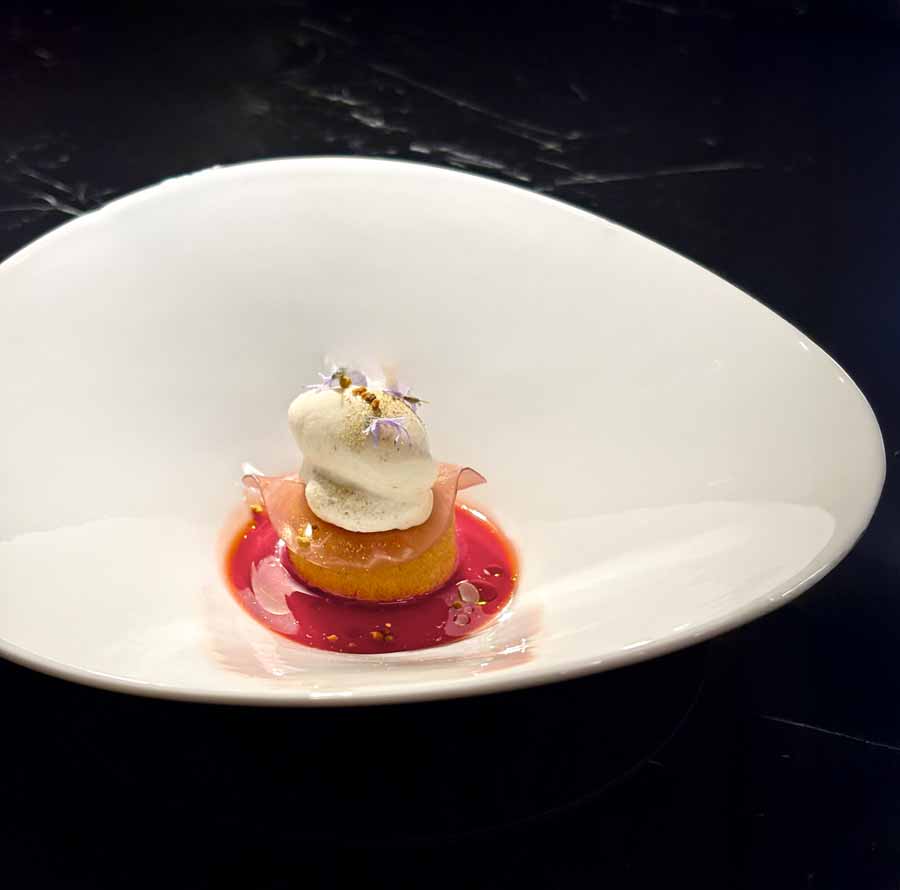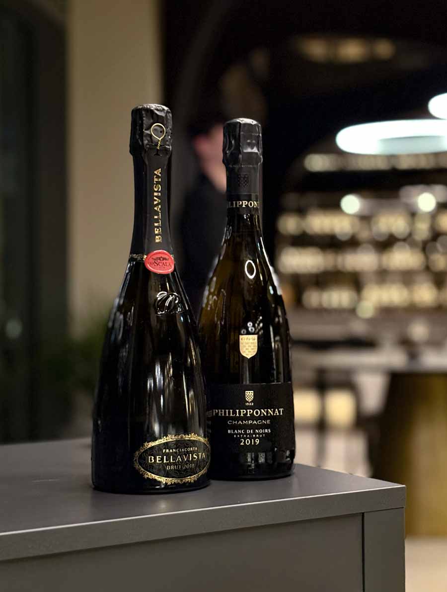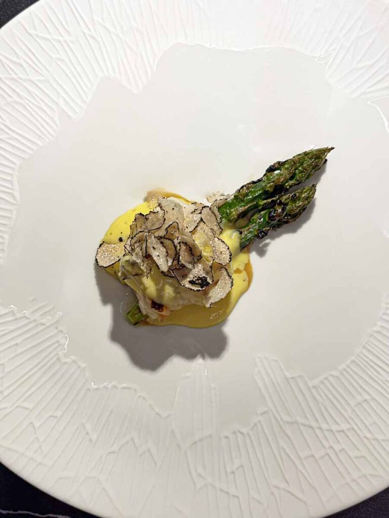 Večera je počela s lijepim izborom šampanjaca i pjenušaca. Pili smo Philipponnatov blanc de noirs iz 2019. godine i franciacortu Bellavista iz 2018. Zatim su na stol došli elegantni pozdravi iz kuhinje, među kojima su nam se najviše svidjeli mali taco s jeguljom i tunom i skuša na savor. Odlični su bili i krumpiri s kavijarom. Focaccia od kiselog tijesta jedan je od elegantnijih primjeraka u hrvatskim fine dining restoranima, dok je maslac fantastičan.