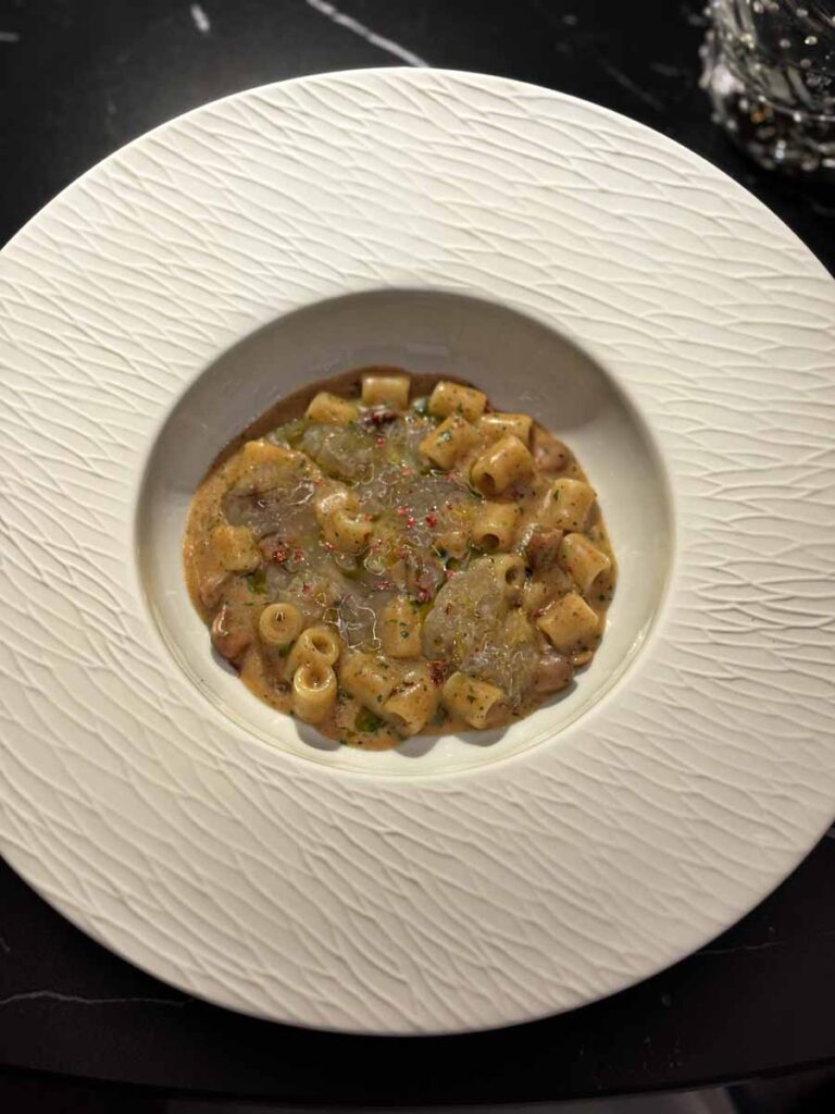 Nakon pozdrava posluženi su nam službeni slijedovi. Koncept La Parenzane spaja morske i kopnene namirnice. Chefovi De Pra i Metulio tako već godinama rade i u Trstu, jer dolaze iz planinskih i obalnih krajeva Italije. Sirovi dimljeni škampi se, primjerice poslužuju s finim ajvarom. Nikad nismo probali škampe s pečenim ajvarom, a Harry’s Piccolo nas je uvjerio da kombinacija funkcionira na najvišoj razini. Iduće jelo nije zaostajalo u hrabrosti. Teleći jezik s crvenim škampima i ježincem i kavijarom od pastrve dugo ćemo pamtiti kao izvrsnu varijantu surf and turfa.