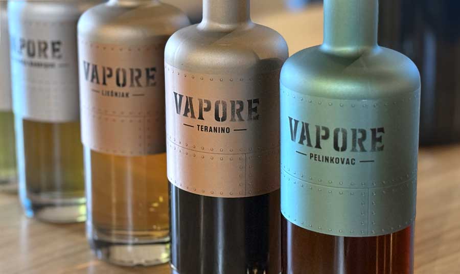 Vapore ima najoriginalnije etikete i brand story među svim zanatskim proizvođačima jakih pića u Hrvatskoj, ne računajući Old Pilot’s. Za grafička rješenja zaslužan je rovinjski studio Tumpić /Prenc. Metalne etikete Vaporea, srebrne za rakije, bakrene za voćne likere i zelenobakrene za biljne likere, tek su dio brandinga i dizajna koji može posramiti većinu hrvatskih marketinških agencija.