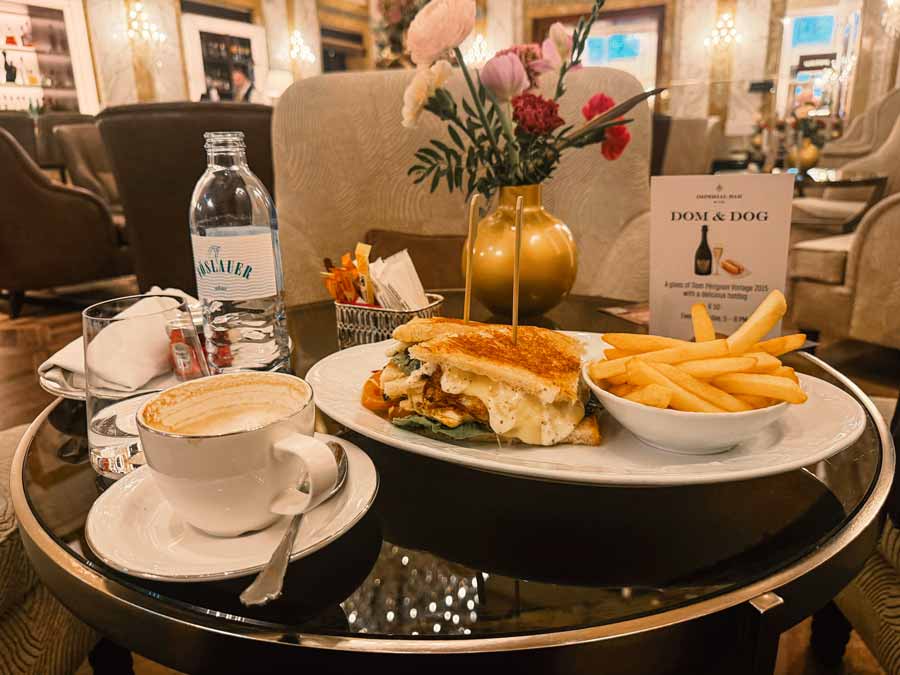 Izuzev deserata, Imperial bar ne drži niti jedno vegetarijansko jelo pa sam zamolila konobara da napravi vegetarijanski klub sendvič i dala jasnu uputu što želim od navedenih sastojaka; samo sir, salata i rajčica. Jednostavnije zaista ne može. Uz to sam naručila čašu šampanjca, negaziranu vodu i kavu i naglasila da želim da kava dođe zadnja, sa šest mini deserata s menja.