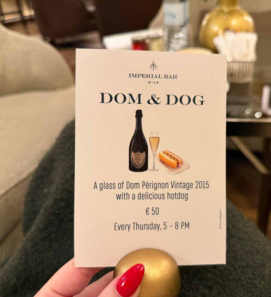 Ambijent Imperial bara je prekrasan. Bar je besprijekorno čist i vrlo udoban. Ponuda šampanjca je odlična, ali šampanjce konobari uopće ne nude gostima niti ih rastaču iz izloženih kibli. Usluga je ljubazna, ali beskrajno spora i apatična. Četvrtkom od 17h do 20h nude Dom & Dog, čašu Dom Perignona 2015 s hot dogom za 50 eura što je, ikako je simpatična, vrlo diskutabilna ideja s obzirom na status brenda Dom Perignon i ambijent u kakvom se poslužuje. Nedjeljom od 12 – 15h poslužuju Imperial Champagne brunch s identičnim jelovnikom i free-flow šampanjcem ali zbunjujuće oglašavaju da se na istom mjestu u isto vrijeme poslužuje i popodnevni čaj, do 16:30 uz elegantnu glazbu vikendom.