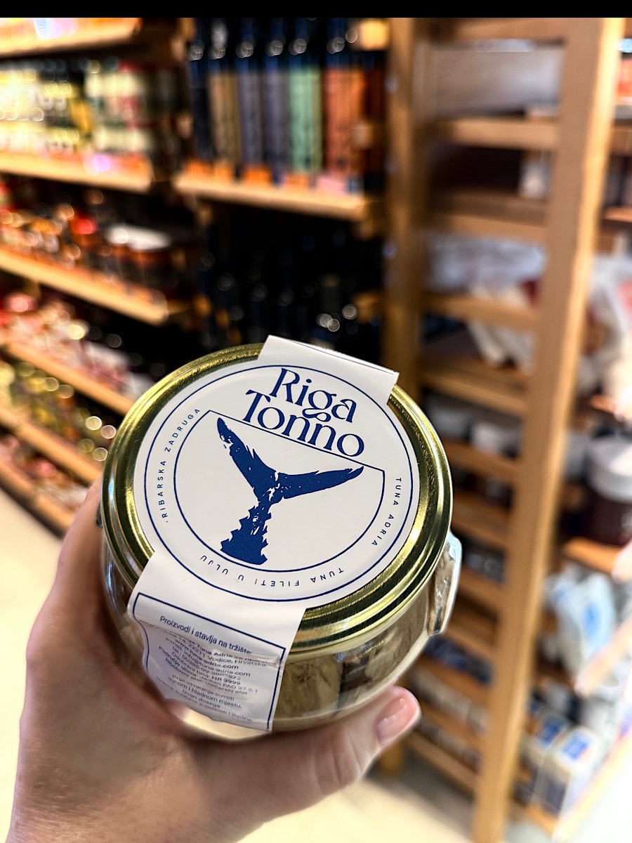 U izlogu s jadranskim konzerviranim ribama pronašli smo čak i plavoperajnu tunu. Ovo je prva konzervirana plavoperajna tuna koju smo vidjeli u Hrvatskoj. Sve konzerve tune u svim trgovinama proizvode se od žutoperajne tune ili od albacore: obje su vrste inferiorne plavoj tuni.