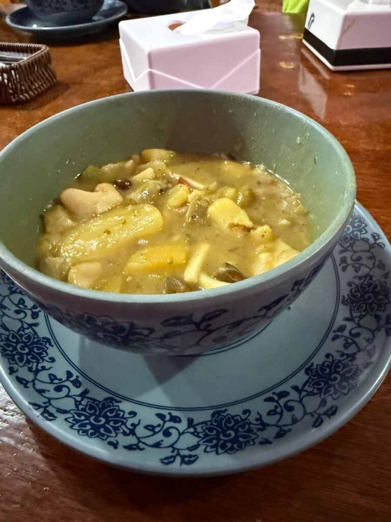 “Hrana u Nepalu je više manje bezveze,” komentira Bogdan. “Jako je prilagođena zapadnjacima i onda je to jako loše izvedeno. Od nepalskih jela mogu se dobiti momosi, vege ili s piletinom, Dal Bath i to je to ja mislim. Razumljivo je da ne obraćaju pažnju na kvalitetu. To im je zadnja briga. Ljudi su jako siromašni i žive jako težak život. Dal bath je super jer se u njemu sve nadopunjuje, pojedeš rižu s tanjura, dođu i dopune ti je i tako sve ostale komponente. Pa kad si gladan nakon hodanja, odlično dođe. U Himalajama se konstanto pije čaj od đumbira s limunom i medom, jer grije. Grije nas i sherpa stew, bogata povrtna juha koja podsjeća na naša variva. Tu je i pržena riža s jajima, razni noodlesi…Voda za piće se obavezno prokuhava. Za svaki slučaj ubaciš u nju tableticu za pročišćavanje, tak da voda ima okus po bazenima. Radi visine moramo piti oko 10 litara dnevno. To je jako važno za aklimatizaciju.” priča Bogdan. “Također, danas smo zadnji put jeli meso, odsad ga više ne jedemo. Šerpe su vegetarijanci, a i meso se često kvari kad se nosi gore u ruksacima. Iza Namche Bazaara u pravilu se izbjegava meso.”