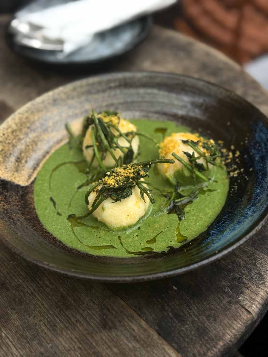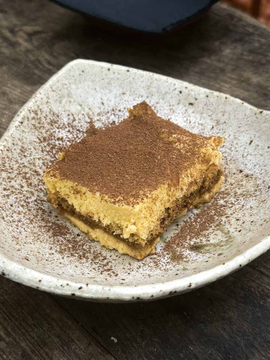 Probali smo još jedno novo jelo na Salovu meniju, gnude od sira koji rade od svog kefira, u umaku od koprive s izdancima hmelja, obilno ali prilično lagano proljetno jelo, i novi desert, netipični tiramisu od mascarponea proizvedenog u Salu, s Cogito kavom. Salov desert samo podsjeća na klasični talijanski tiramisu, krema je puno gušća i kiselkasta, kava intenzivna i također s izraženim kiselinama, pa ne očekujte tipične okuse, ali desert sam po sebi je osvježavajuć, ukusan nije presladak je i pun je života.