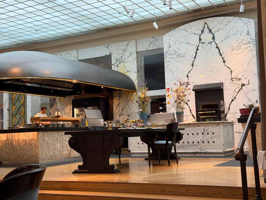 Velika kuhinja je potpuno otvorena prema sali, pa gosti mogu pratitisvaki detalj pripreme jela. Vinska karta obuhvaća širok spektar vina iz Austrije i drugih vinskih regija iz cijelog svijeta. Osoblje restorana je izuzetno ljubazno, ali ne i strogo formalno kako biste očekivali od jednog od najskupljih hotela u Beču.