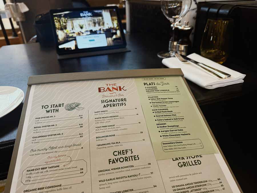 Moguće je birati između tri predjela, tri glavna jela i tri deserta. Neovisno o tome za koju kombinaciju se odlučite, vrijede gore navedene cijene. U ponudi su i dva vina na čaše po izboru somelliera, po prijateljskoj cijeni od 11 i 13 eura. Za razliku od hotela iste kategorije sa sličnim konceptom dnevnih jelovnika, poput primjerice Ritz Carltona u Beču o kojem smo pisali, The Bank vrlo jasno komunicira i nudi dnevni meni zajedno s a la carte jelovnikom, pa se gost ne osjeća kao da mu se nameće a la carte narudžba koja za potpuno ista jela i količinu može ispasti i dvostruko skuplja. Couvert se dodatno naplaćuju tri eura po osobi.