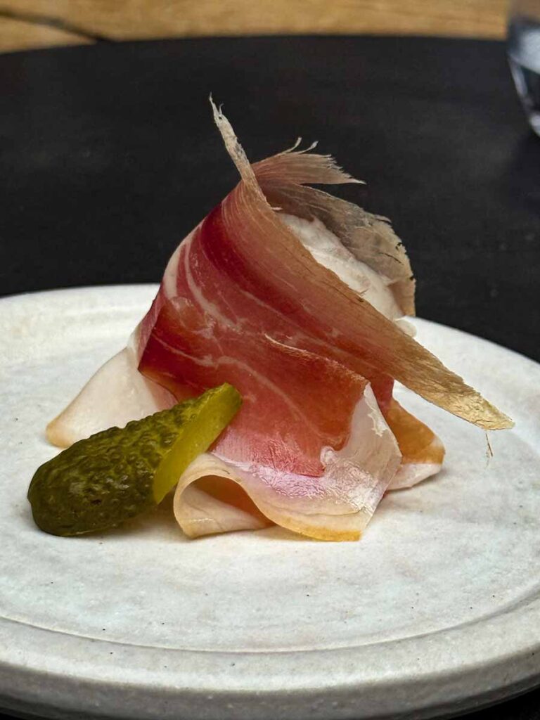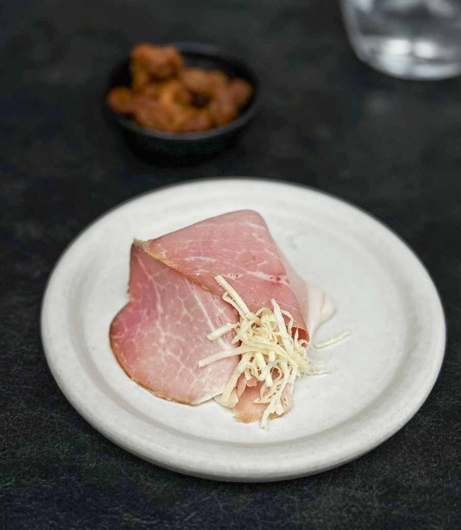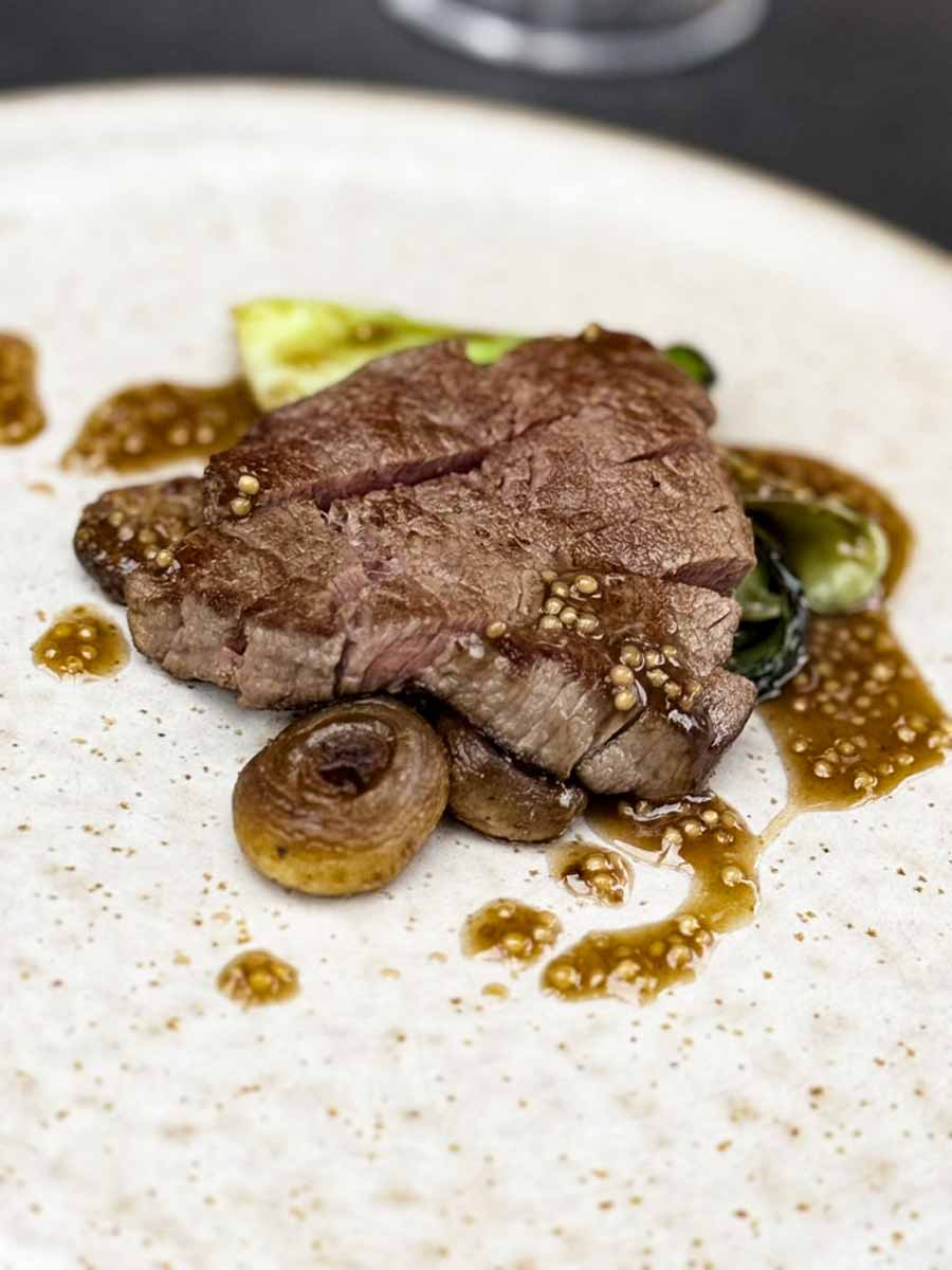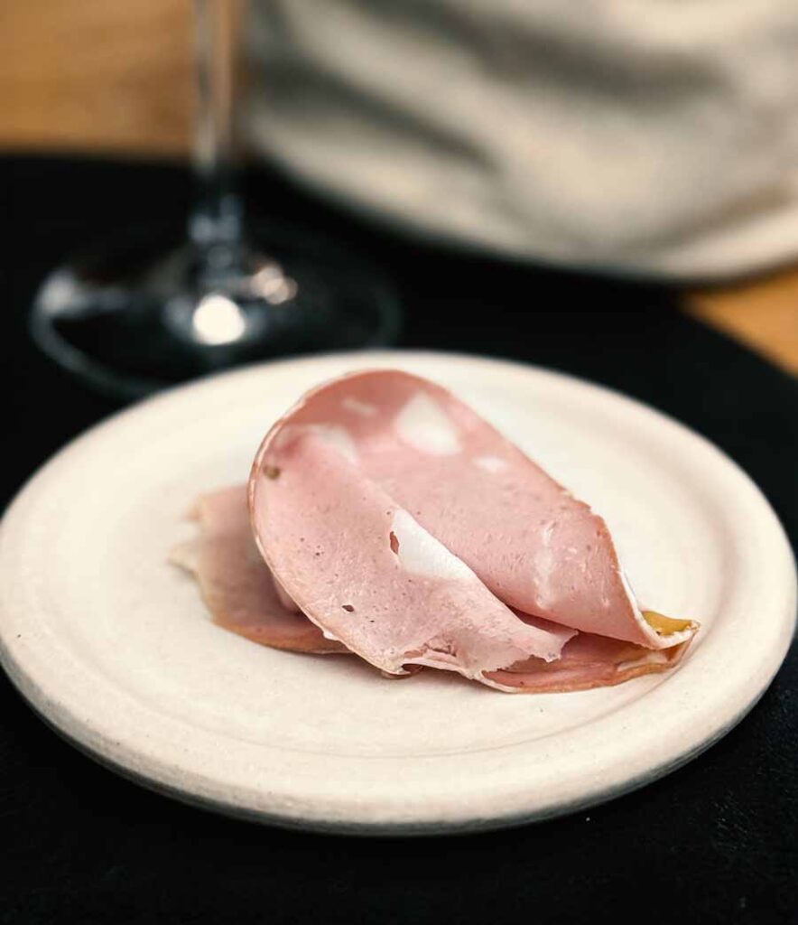 Na katu prije ulaska u restoran, smještena je manja vinoteka s važnim etiketama iz svih slovenskih vinogorja, ali i s internacionalnim klasicima poput Krug i Dom Pérignona. Janko Kodila kaže da će asortiman proširiti i hrvatskim vinima. U restoranu s otvorenom kuhinjom probali smo niz suhomesnatih divota, među kojima je briljirao pršut od mangulice. Zatim je došao red na preslan odrezak od mangulice da bi ručak završili fenomenalnim biftekom od japanskog wagyua.
