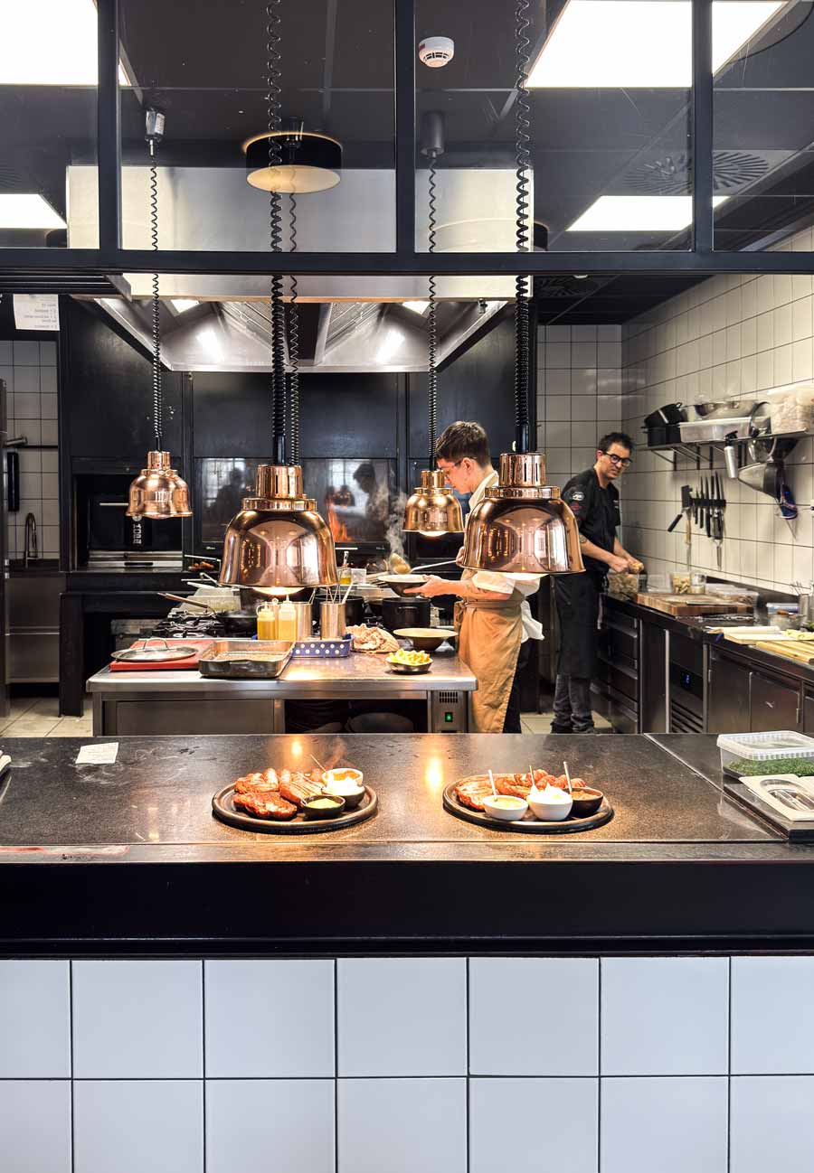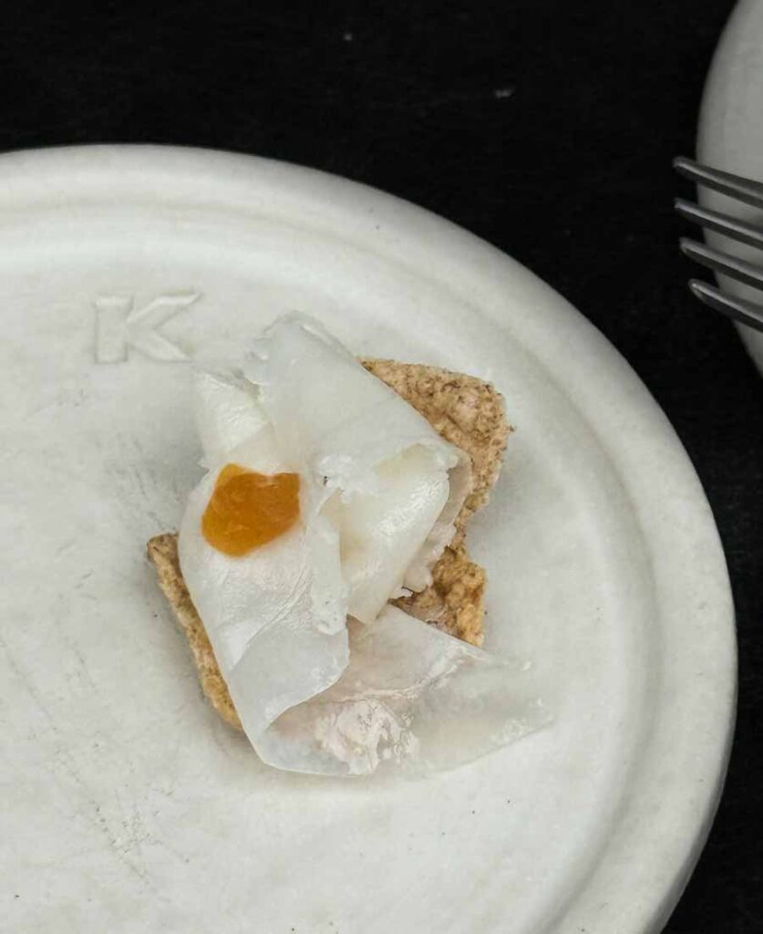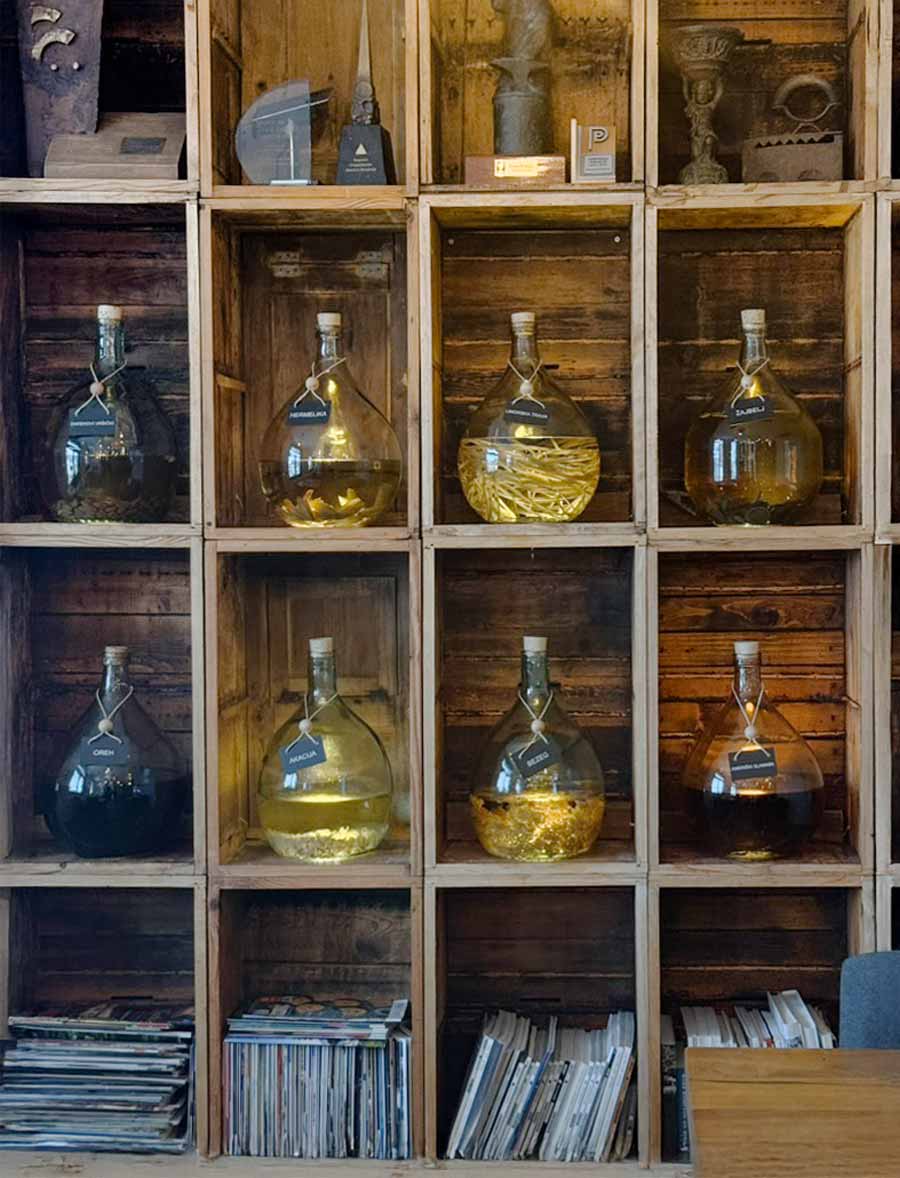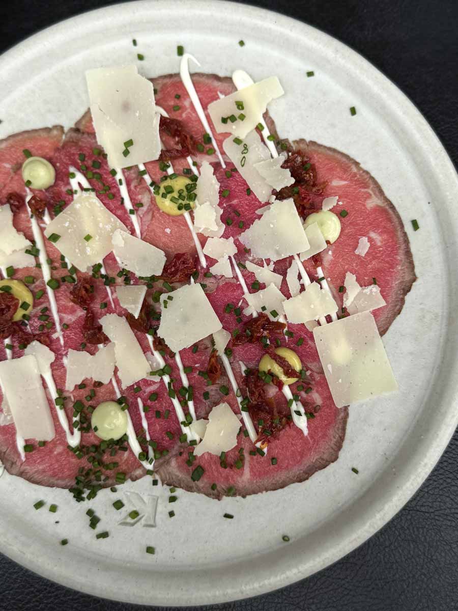 Na katu prije ulaska u restoran, smještena je manja vinoteka s važnim etiketama iz svih slovenskih vinogorja, ali i s internacionalnim klasicima poput Krug i Dom Pérignona. Janko Kodila kaže da će asortiman proširiti i hrvatskim vinima. U restoranu s otvorenom kuhinjom probali smo niz suhomesnatih divota, među kojima je briljirao pršut od mangulice. Zatim je došao red na preslan odrezak od mangulice da bi ručak završili fenomenalnim biftekom od japanskog wagyua.